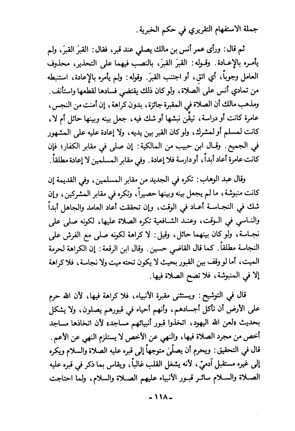 قال في التوشيح: ويستثنى مقبرة الأنبياء، فلا كراهة فيها, لأن الله حرم على الأرض أن تأكل أجسادهم، وأنهم أحياء في قبورهم يصلون، ولا يشكل بحديث "لعن الله اليهود، اتخذوا قبور أنبيائهم مساجد" لأن اتخاذها مساجد أخص من مجرد الصلاة فيها، والنهي عن الأخص لا يستلزم النهي عن الأعم. قال في التحقيق: ويحرم أن يصلّى متوجهًا إلى قبره عليه الصلاة والسلام ويكره إلى غيره مستقبل آدميٌ, لأنه يشغل القلب غالبًا، ويقاس بما ذكر في قبره عليه الصلاة والسلام سائر قبور الأنبياء عليهم الصلاة والسلام، ولما احتاجت
