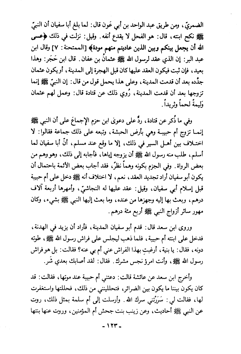 وفي ما ذُكر عن قتادة، ردٌّ على دعوى ابن حزم الإجماعَ على أن النبي -صلى الله عليه وسلم- إنما تزوج أم حبيبة وهي بأرض الحبشة، وتبعه على ذلك جماعة فقالوا: لا اختلاف بين أهل السير في ذلك، إلا ما وقع عند مسلم، أنّ أبا سفيان لما أسلم، طلب منه رسول الله -صلى الله عليه وسلم- أن يزوجه إياها، فأجابه إلى ذلك، وهو وهم من بعض الرواة. وفي الجزم بكونه وهمًا نظرٌ، فقد أجاب بعض الأئمة باحتمال أن يكون أبو سفيان أراد تجديد العقد، نعم، لا اختلاف أنه -صلى الله عليه وسلم- دخل على أم حبيبة قبل إسلام أبي سفيان، وقيل: عقد عليها له النجاشيّ، وأمهرها أربعة آلاف درهم، وبعث بها إليه وجهزها من عنده، وما بعث إليها النبي -صلى الله عليه وسلم- بشيء، وكان مهور سائر أزواج النبي -صلى الله عليه وسلم- أربع مئة درهم.