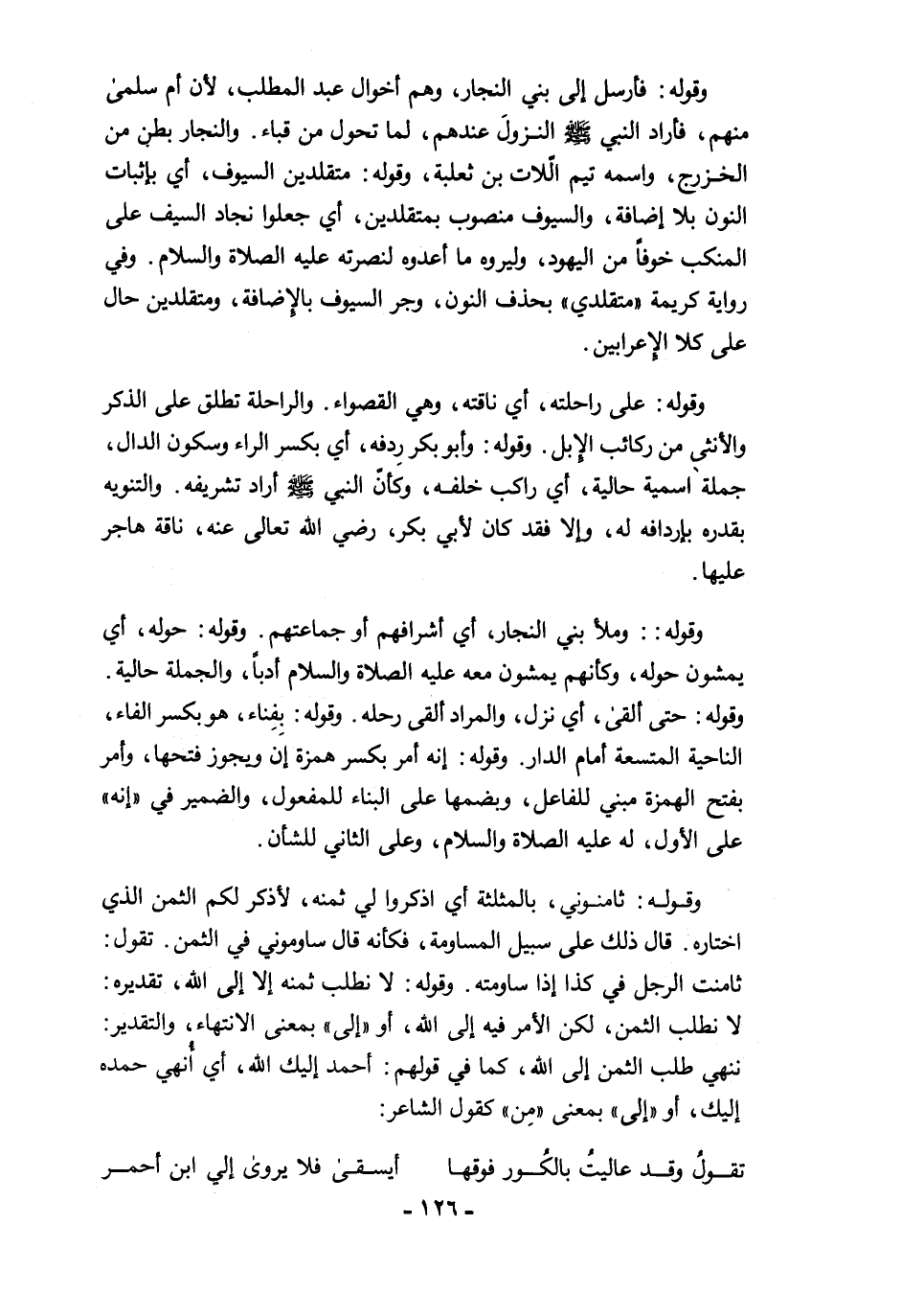 وقوله: وملأ بني النجار، أي أشرافهم أو جماعتهم. وقوله: حوله، أي يمشون حوله، وكأنهم يمشون معه عليه الصلاة والسلام أدبًا، والجملة حالية. وقوله: حتى ألقى، أي نزل، والمراد ألقى رحله. وقوله: بفِناء، هو بكسر الفاء، الناحية المتسعة أمام الدار. وقوله: إنه أمر بكسر همزة إن ويجوز فتحها، وأمر بفتح الهمزة مبني للفاعل، وبضمها على البناء للمفعول، والضمير في "إنه" على الأول، له عليه الصلاة والسلام، وعلى الثاني للشأن.