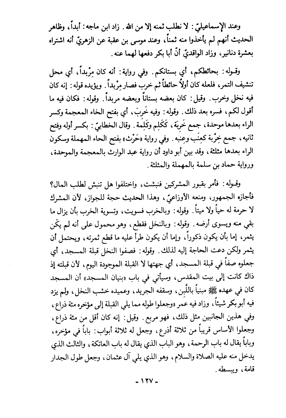 وقوله: فأمر بقبور المشركين فنبشت، واختلفوا هل تنبش لطلب المال؟ فأجازه الجمهور، ومنعه الأوزاعيّ، وهذا الحديث حجة للجواز, لأن المشرك لا حرمة له حيًا ولا ميتًا. وقوله: وبالخرب فسويت، وتسوية الخرب بأن يزال ما بقي منه ويسوى أرضه. وقوله: وبالنخل فقطع، وهو محمول على أنه لم يكن يثمر، إما بأن يكون ذكورًا، وإما أن يكون طرأ عليه ما قطع ثمرته، ويحتمل أن يثمر ولكن دعت الحاجة إليه لذلك. وقوله: فصفوا النخل قبلة المسجد، أي جعلوه صفًا في قبلة المسجد، أي جهتها لا القبلة الموجودة اليوم, لأن قبلته إذ ذاك كانت إلى بيت المقدس، وسيأتي في باب "بنيان المسجد" أن المسجد كان في عهده -صلى الله عليه وسلم- مبنيًا باللَّبِن، وسقفه الجريد، وعميده خشب النخل، ولم يزد فيه أبو بكر شيئًا، وزاد فيه عمر "وجعلوا طوله مما يلي القبلة إلى مؤخره مئة ذراع، وفي هذين الجانبين مثل ذلك، فهو مربع. وقيل: إنه كان أقل من مئة ذراع، وجعلوا الأساس قريبًا من ثلاثة أذرع، وجعل له ثلاثة أبواب: بابًا في مؤخره، وبابًا يقال له باب الرحمة، وهو الباب الذي يقال له باب العاتكة، والثالث الذي يدخل منه عليه الصلاة والسلام، وهو الذي يلي آل عثمان، وجعل طول الجدار قامة، ويبسطه.