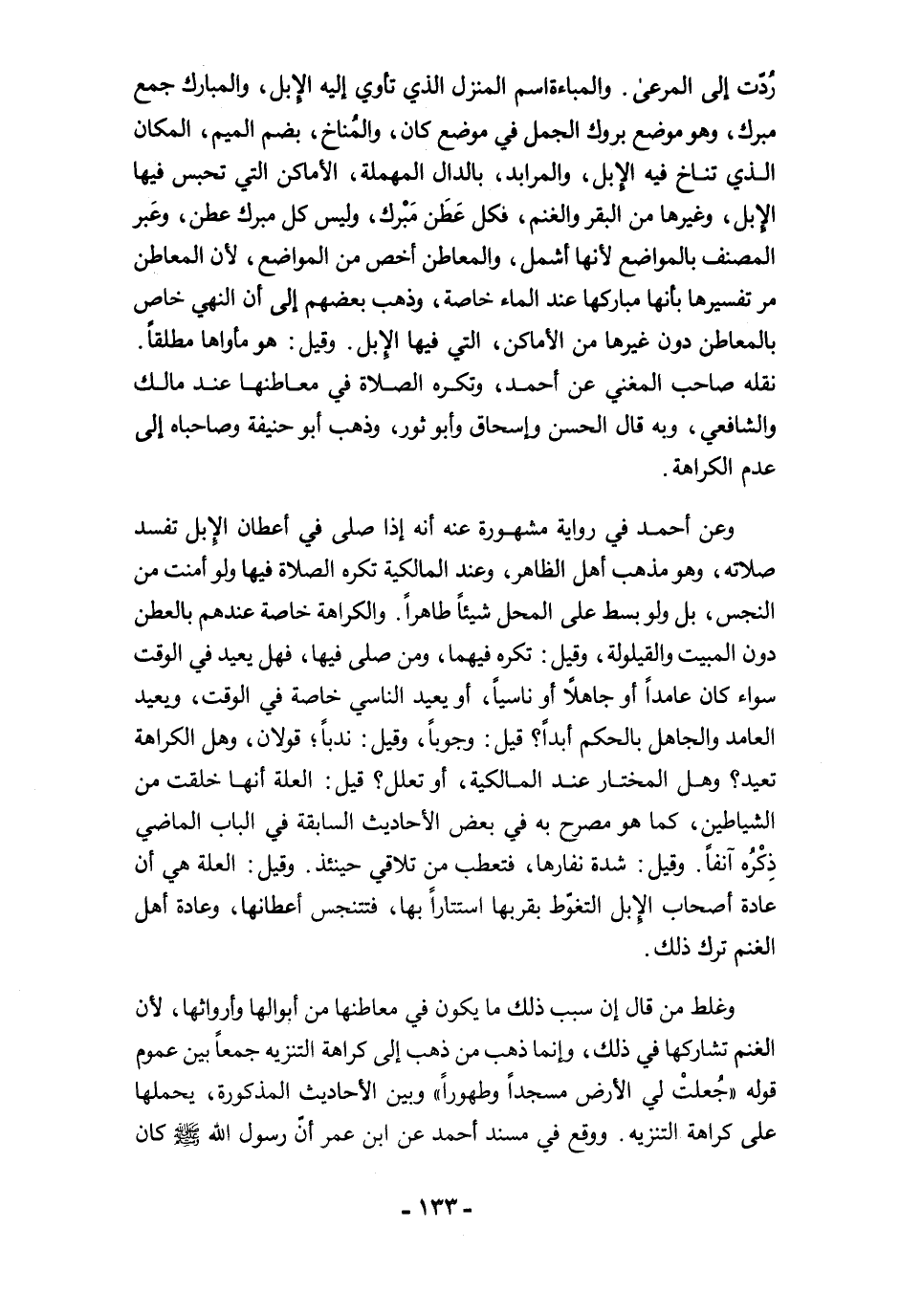 رُدّت إلى المرعى. والمباءة اسم المنزل الذي تأوي إليه الإبل، والمبارك جمع مبرك، وهو موضع بروك الجمل في موضع كان، والمُناخ، بضم الميم، المكان الذي تناخ فيه الإبل، والمرابد، بالدال المهملة، الأماكن التي تحبس فيها الإبل، وغيرها من البقر والغنم، فكل عَطَن مَبْرك، وليس كل مبرك عطن، وعَبر المصنف بالمواضع لأنها أشمل، والمعاطن أخص من المواضع؛ لأن المعاطن مرَّ تفسيرها بأنها مباركها عند الماء خاصة، وذهب بعضهم إلى أن النهي خاص بالمعاطن دون غيرها من الأماكن، التي فيها الإبل. وقيل: هو مأواها مطلقًا. نقله صاحب المغني عن أحمد، وتكره الصلاة في معاطنها عند مالك والشافعي، وبه قال الحسن وإسحاق وأبو ثور، وذهب أبو حنيفة وصاحباه إلى عدم الكراهة.