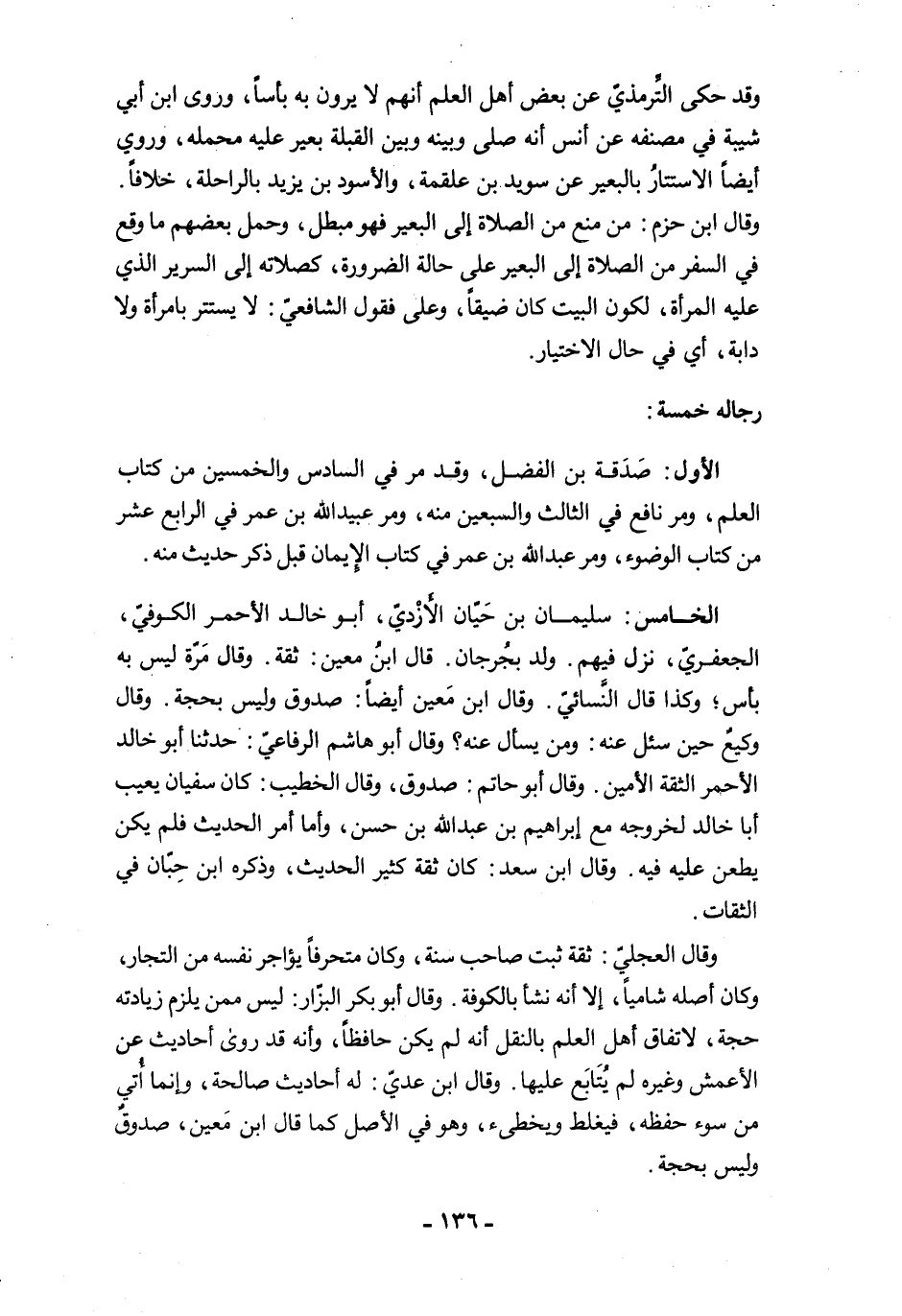 الخامس: سليمان بن حَيّان الأَزْديّ، أبو خالد الأحمر الكوفيّ، الجعفريّ، نزل فيهم. ولد بجُرجان. قال ابنُ معين: ثقة. وقال مَرّة ليس به بأس؛ وكذا قال النَّسائيّ. وقال ابن مَعين أيضًا: صدوق وليس بحجة. وقال وكيعٌ حين سئل عنه: ومن يسأل عنه؟ وقال أبو هاشم الرفاعيّ: حدثنا أبو خالد الأحمر الثقة الأمين. وقال أبو حاتم: صدوق، وقال الخطيب: كان سفيان يعيب أبا خالد لخروجه مع إبراهيم بن عبد الله بن حسن، وأما أمر الحديث فلم يكن يطعن عليه فيه. وقال ابن سعد: كان ثقة كثير الحديث، وذكره ابن حِبّان في الثقات.