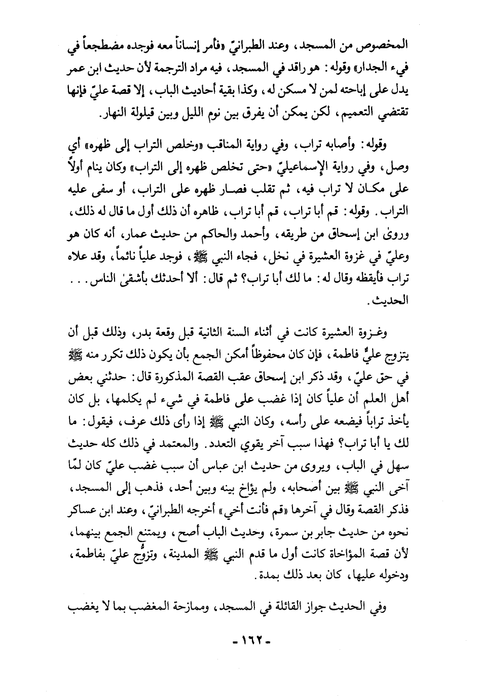 وغزوة العشيرة كانت في أثناء السنة الثانية قبل وقعة بدر، وذلك قبل أن يتزوج علي فاطمة، فإن كان محفوظًا أمكن الجمع بأن يكون ذلك تكرر منه -صلى الله عليه وسلم- في حق عليّ، وقد ذكر ابن إسحاق عقب القصة المذكورة قال: حدثني بعض أهل العلم أن عليًا كان إذا غضب على فاطمة في شيء لم يكلمها، بل كان يأخذ ترابًا فيضعه على رأسه، وكان النبي -صلى الله عليه وسلم- إذا رأى ذلك عرف، فيقول: ما لك يا أبا تراب؟ فهذا سبب آخر يقوي التعدد. والمعتمد في ذلك كله حديث سهل في الباب، ويروى من حديث ابن عباس أن سبب غضب عليّ كان لمّا آخى النبي -صلى الله عليه وسلم- بين أصحابه، ولم يؤاخ بينه وبين أحد، فذهب إلى المسجد، فذكر القصة وقال في آخرها "قم فأنت أخي" أخرجه الطبرانيّ، وعند ابن عساكر نحوه من حديث جابر بن سمرة، وحديث الباب أصح، ويمتنع الجمع بينهما، لأن قصة المؤاخاة كانت أول ما قدم النبي -صلى الله عليه وسلم- المدينة، وتزوُّج عليّ بفاطمة، ودخوله عليها، كان بعد ذلك بمدة.