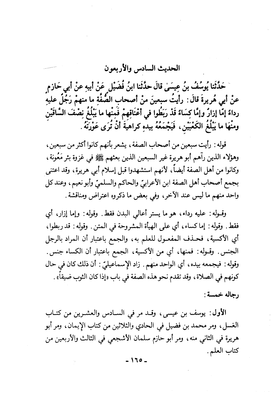 حَدَّثَنَا يُوسُفُ بْنُ عِيسَى قَالَ حَدَّثَنَا ابْنُ فُضَيْلٍ عَنْ أَبِيهِ عَنْ أَبِي حَازِمٍ عَنْ أَبِي هُرَيْرَةَ قَالَ: رَأَيْتُ سَبْعِينَ مِنْ أَصْحَابِ الصُّفَّةِ، مَا مِنْهُمْ رَجُلٌ عَلَيْهِ رِدَاءٌ، إِمَّا إِزَارٌ وَإِمَّا كِسَاءٌ، قَدْ رَبَطُوا فِي أَعْنَاقِهِمْ، فَمِنْهَا مَا يَبْلُغُ نِصْفَ السَّاقَيْنِ، وَمِنْهَا مَا يَبْلُغُ الْكَعْبَيْنِ، فَيَجْمَعُهُ بِيَدِهِ، كَرَاهِيَةَ أَنْ تُرَى عَوْرَتُهُ.