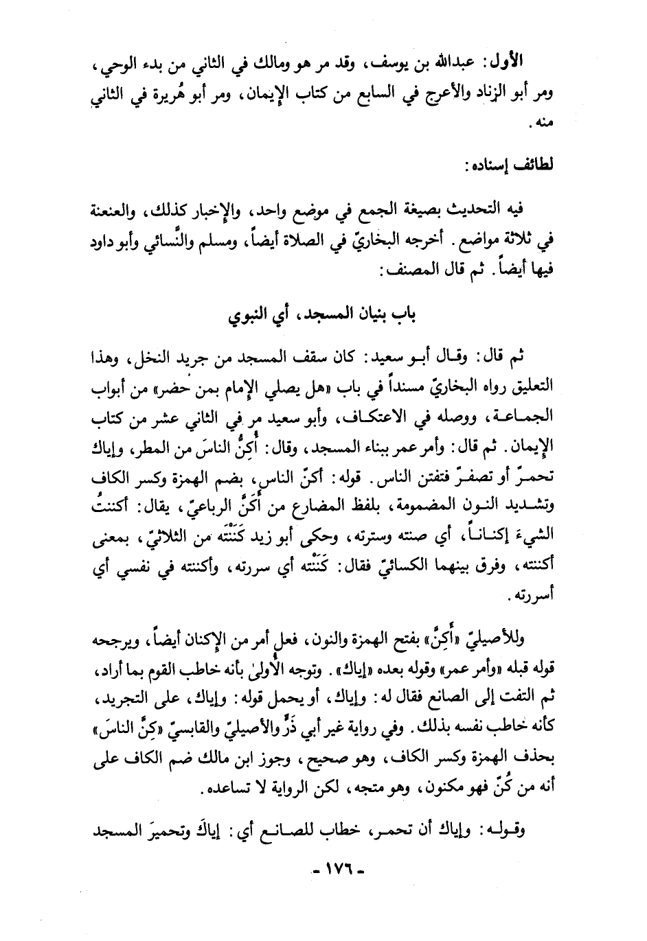 ثم قال: وقال أبو سعيد: كان سقف المسجد من جريد النخل، وهذا التعليق رواه البخاريّ مسندًا في باب "هل يصلي الإِمام بمن حضر" من أبواب الجماعة، ووصله في الاعتكاف، وأبو سعيد مرَّ في الثاني عشر من كتاب الإيمان. ثم قال: وأمر عمر ببناء المسجد، وقال: أُكِنُّ الناسَ من المطر، وإياك تحمرّ أو تصفرّ فتفتن الناس. قوله: أكنّ الناس، بضم الهمزة وكسر الكاف وتشديد النون المضمومة، بلفظ المضارع من أُكَنَّ الرباعيّ، يقال: أكننتُ الشيءَ إكنانًا، أي صنته وسترته، وحكى أبو زيد كَنَنْته من الثلاثيّ، بمعنى أكننته، وفرق بينهما الكسائيّ فقال: كنَنْته أي سررته، وأكننته في نفسي أي أسررته.