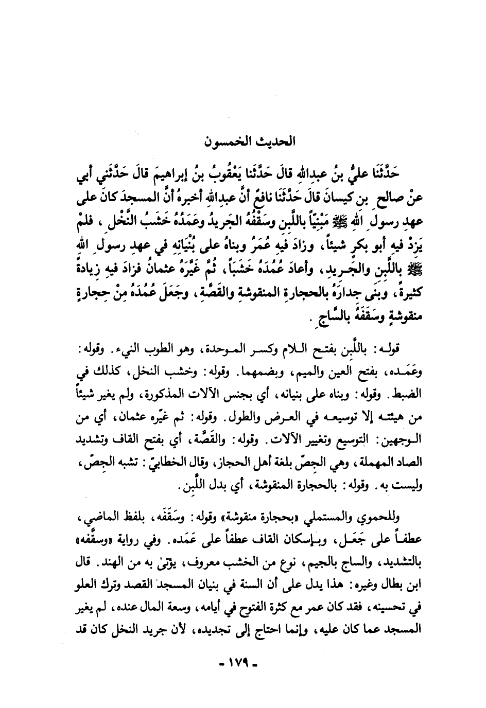 حَدَّثَنَا عَلِيُّ بْنُ عَبْدِ اللَّهِ قَالَ حَدَّثَنَا يَعْقُوبُ بْنُ إِبْرَاهِيمَ بْنِ سَعْدٍ قَالَ حَدَّثَنِي أَبِي عَنْ صَالِحِ بْنِ كَيْسَانَ قَالَ حَدَّثَنَا نَافِعٌ أَنَّ عَبْدَ اللَّهِ أَخْبَرَهُ أَنَّ الْمَسْجِدَ كَانَ عَلَى عَهْدِ رَسُولِ اللَّهِ -صلى الله عليه وسلم- مَبْنِيًّا بِاللَّبِنِ، وَسَقْفُهُ الْجَرِيدُ، وَعُمُدُهُ خَشَبُ النَّخْلِ، فَلَمْ يَزِدْ فِيهِ أَبُو بَكْرٍ شَيْئًا، وَزَادَ فِيهِ عُمَرُ وَبَنَاهُ عَلَى بُنْيَانِهِ فِي عَهْدِ رَسُولِ اللَّهِ -صلى الله عليه وسلم- بِاللَّبِنِ وَالْجَرِيدِ، وَأَعَادَ عُمُدَهُ خَشَبًا، ثُمَّ غَيَّرَهُ عُثْمَانُ، فَزَادَ فِيهِ زِيَادَةً كَثِيرَةً، وَبَنَى جِدَارَهُ بِالْحِجَارَةِ الْمَنْقُوشَةِ وَالْقَصَّةِ، وَجَعَلَ عُمُدَهُ مِنْ حِجَارَةٍ مَنْقُوشَةٍ، وَسَقَفَهُ بِالسَّاجِ.