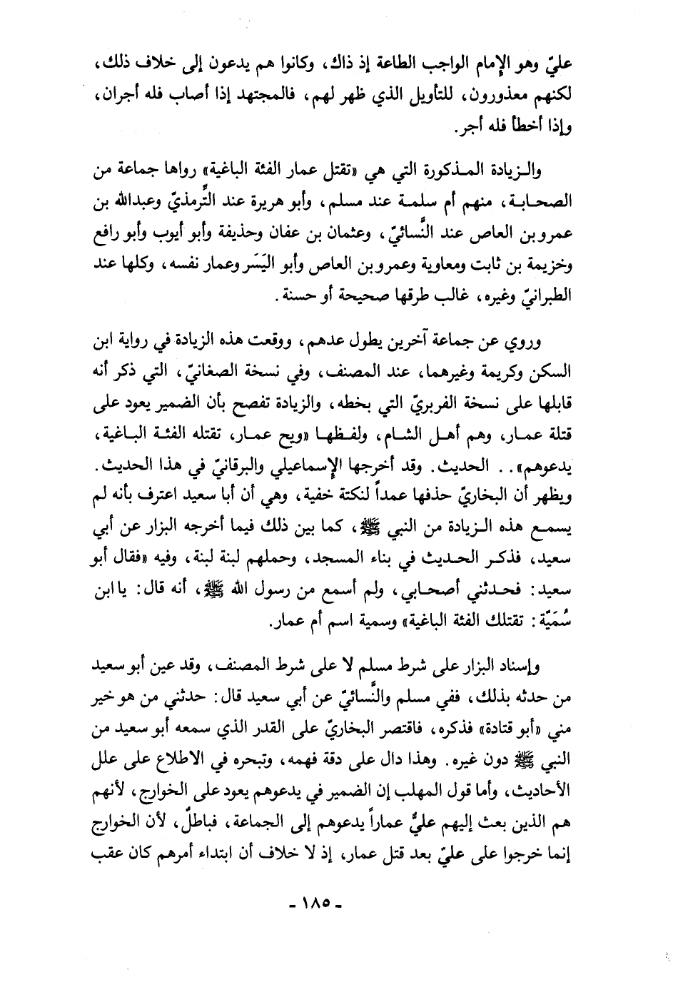 والزيادة المذكورة التي هي "تقتل عمار الفئة الباغية" رواها جماعة من الصحابة، منهم أم سلمة عند مسلم، وأبو هريرة عند التِّرمذيّ وعبد الله بن عمرو بن العاص عند النَّسائيّ، وعثمان بن عفان وحذيفة وأبو أيوب وأبو رافع وخزيمة بن ثابت ومعاوية وعمرو بن العاص وأبو اليَسَر وعمار نفسه، وكلها عند الطبرانيّ وغيره، غالب طرقها صحيحة أو حسنة.