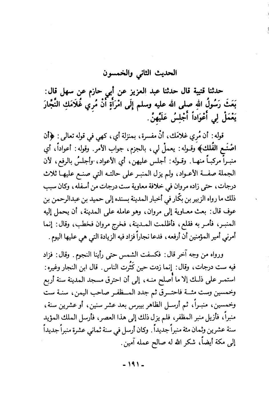 ورواه من وجه آخر قال: فكسفت الشمس حتى رأينا النجوم. وقال: فزاد فيه ست درجات، وقال: إنما زدت حين كَثُرت الناس. قال ابن النجار وغيره: استمر على ذلك إلا ما أُصلح منه، إلى أن احترق مسجد المدينة سنة أربع وخمسين وست مئة فاحترق ثم جدد المظفر صاحب اليمن، سنة ست وخمسين، منبرًا، ثم أرسل الظاهر بيبرس بعد عشر سنين، أو عشرين سنة، منبرًا، فأزيل منبر المظفر، فلم يزل ذلك إلى هذا العصر، فأرسل الملك المؤيد سنة عشرين وثمان مئة منبرًا جديدًا. وكان أرسل في سنة ثماني عشرة منبرًا جديدًا إلى مكة أيضًا، شكر الله له صالح عمله آمين.