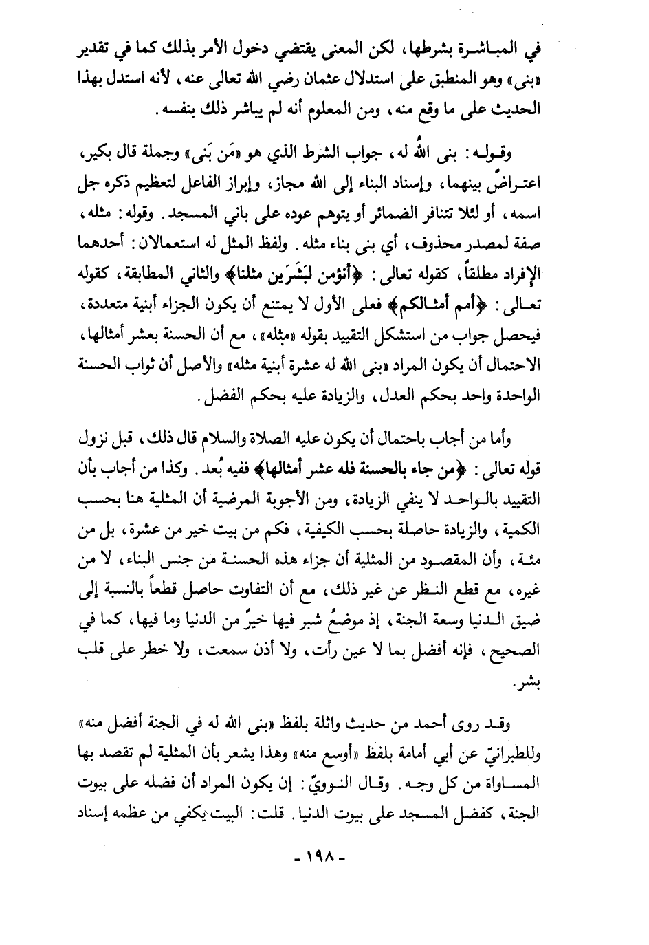 وأما من أجاب باحتمال أن يكون عليه الصلاة والسلام قال ذلك، قبل نزول قوله تعالى: {مَنْ جَاءَ بِالْحَسَنَةِ فَلَهُ عَشْرُ أَمْثَالِهَا} ففيه بُعد. وكذا من أجاب بأن التقييد بالواحد لا ينفي الزيادة، ومن الأجوبة المرضية أن المثلية هنا بحسب الكمية، والزيادة حاصلة بحسب الكيفية، فكم من بيت خير من عشرة، بل من مئة، وأن المقصود من المثلية أن جزاء هذه الحسنة من جنس البناء، لا من غيره، مع قطع النظر عن غير ذلك، مع أن التفاوت حاصل قطعًا بالنسبة إلى ضيق الدنيا وسعة الجنة، إذ موضعُ شبر فيها خير من الدنيا وما فيها، كما في الصحيح، فإنه أفضل بما لا عين رأت، ولا أذن سمعت، ولا خطر على قلب بشر.
