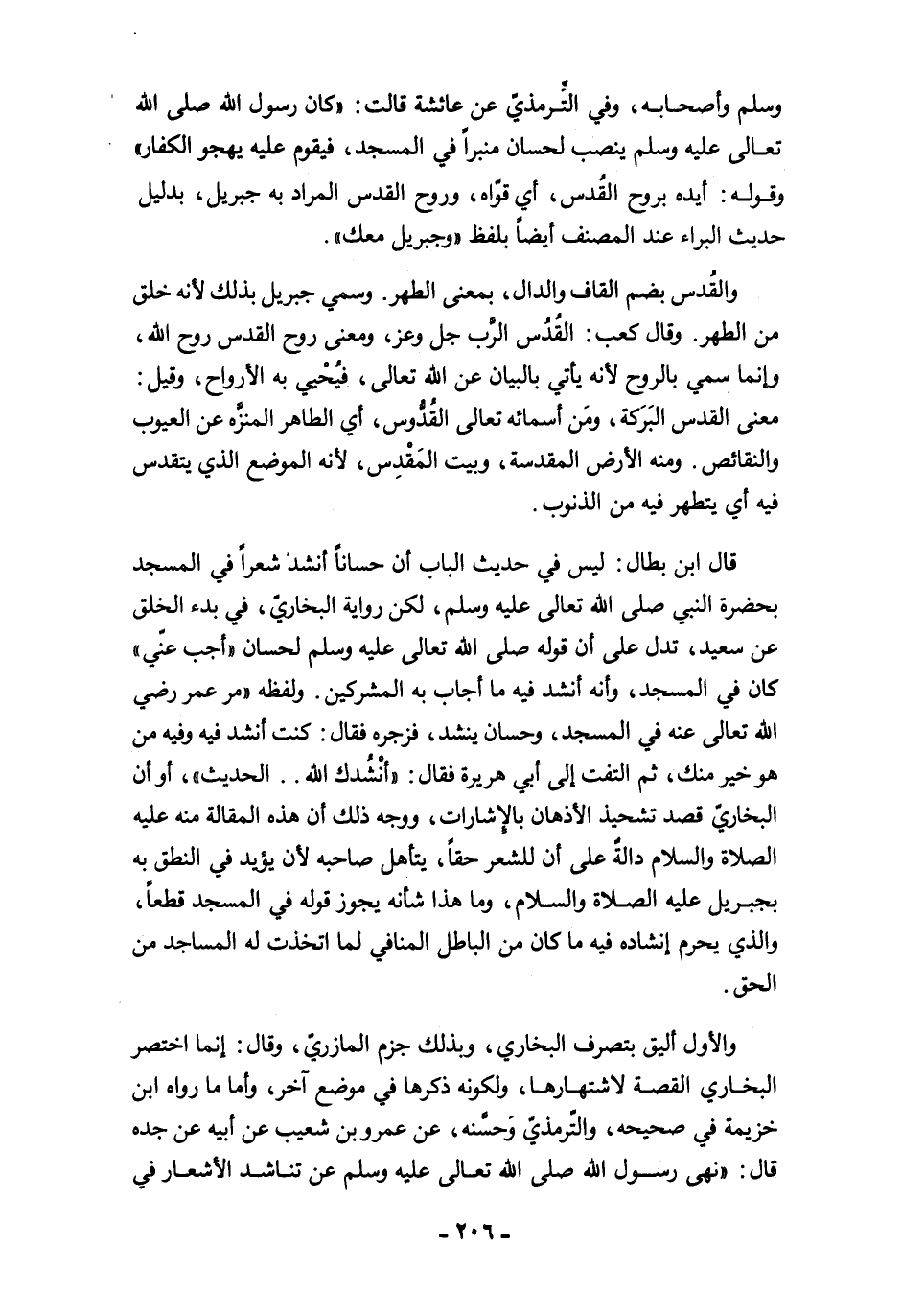 قال ابن بطال: ليس في حديث الباب أن حسانًا أنشد شعرًا في المسجد بحضرة النبي صلى الله تعالى عليه وسلم، لكن رواية البخاريّ، في بدء الخلق عن سعيد، تدل على أن قوله صلى الله تعالى عليه وسلم لحسان "أحب عنّي" كان في المسجد، وأنه أنشد فيه ما أجاب به المشركين. ولفظه "مر عمر رضي الله تعالى عنه في المسجد، وحسان ينشد، فزجره فقال: كنت أنشد فيه وفيه من هو خير منك، ثم التفت إلى أبي هريرة فقال: "أنْشُدك الله .. الحديث"، أو أن البخاريّ قصد تشحيذ الأذهان بالإشارات، ووجه ذلك أن هذه المقالة منه عليه الصلاة والسلام دالةٌ على أن للشعر حقًا، يتأهل صاحبه لأن يؤيد في النطق به بجبريل عليه الصلاة والسلام، وما هذا شأنه يجوز قوله في المسجد قطعًا، والذي يحرم إنشاده فيه ما كان من الباطل المنافي لما اتخذت له المساجد من الحق.