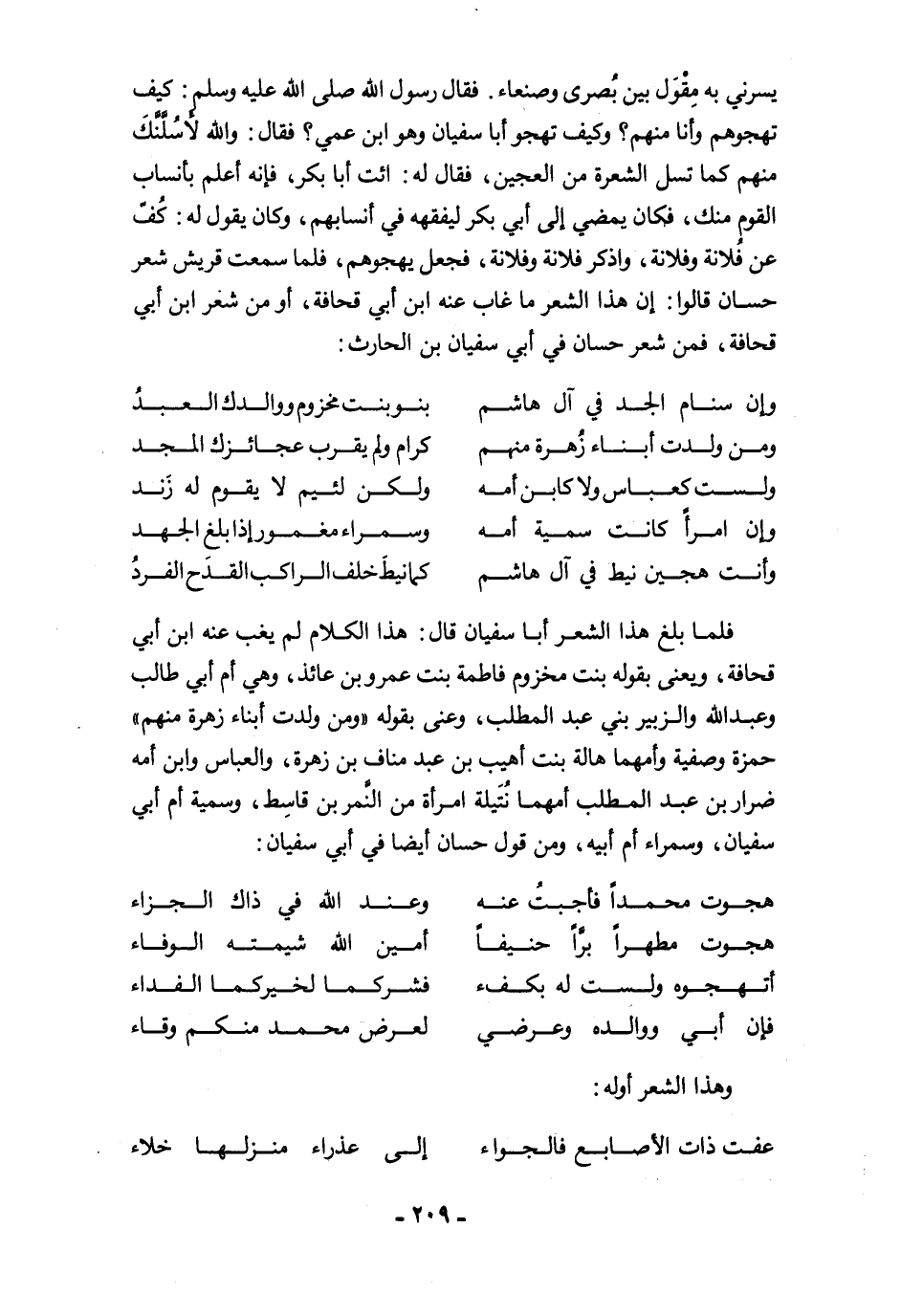 فلما بلغ هذا الشعر أبا سفيان قال: هذا الكلام لم يغب عنه ابن أبي قحافة، ويعنى بقوله بنت مخزوم فاطمة بنت عمرو بن عائذ، وهي أم أبي طالب وعبد الله والزبير بني عبد المطلب، وعنى بقوله "ومن ولدت أبناء زهرة منهم" حمزة وصفية وأمهما هالة بنت أهيب بن عبد مناف بن زهرة، والعباس وابن أمه ضرار بن عبد المطلب أمهما نُتَيلة امرأة من النَّمر بن قاسِط، وسمية أم أبي سفيان، وسمراء أم أبيه، ومن قول حسان أيضًا في أبي سفيان: