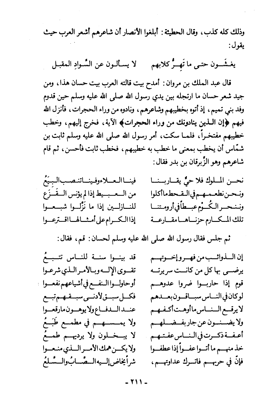 قال عبد الملك بن مروان: أمدح بيت قالته العرب بيت حسان هذا، ومن جيد شعر حسان ما ارتجله بين يدي رسول الله صلى الله عليه وسلم حين قدوم وقد بني تميم، إذ أتوه بخطيبهم وشاعرهم، ونادوه من وراء الحجرات، فأنزل الله فيهم {إِنَّ الَّذِينَ يُنَادُونَكَ مِنْ وَرَاءِ الْحُجُرَاتِ} الآية، فخرج إليهم، وخطب خطيبهم مفتخرًا، فلما سكت، أمر رسول الله صلى الله عليه وسلم ثابت بن شمّاس أن يخطب بمعنى ما خطب به خطيبهم، فخطب ثابت فأحسن، ثم قام شاعرهم وهو الزِّبرقان بن بدر فقال: