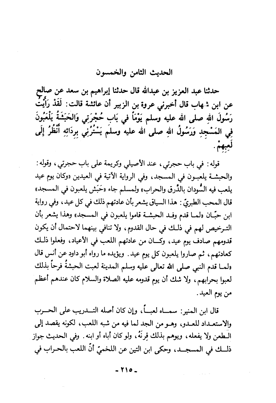 حَدَّثَنَا عَبْدُ الْعَزِيزِ بْنُ عَبْدِ اللَّهِ قَالَ حَدَّثَنَا إِبْرَاهِيمُ بْنُ سَعْدٍ عَنْ صَالِحٍ عَنِ ابْنِ شِهَابٍ قَالَ أَخْبَرَنِي عُرْوَةُ بْنُ الزُّبَيْرِ أَنَّ عَائِشَةَ قَالَتْ: لَقَدْ رَأَيْتُ رَسُولَ اللَّهِ -صلى الله عليه وسلم- يَوْمًا في بَابِ حُجْرَتِي، وَالْحَبَشَةُ يَلْعَبُونَ فِي الْمَسْجِدِ وَرَسُولُ اللَّهِ -صلى الله عليه وسلم- يَسْتُرُنِي بِرِدَائِهِ، أَنْظُرُ إِلَى لَعِبِهِمْ.