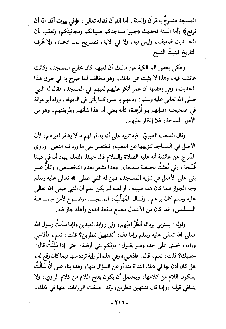 وحكى بعض المالكية عن مالك أن لعبهم كان خارج المسجد، وكانت عائشة فيه، وهذا لا يثبت عن مالك، وهو مخالف لما صرح به في طرق هذا الحديث، وفي بعضها أن عمر أنكر عليهم لعبهم في المسجد، فقال له النبي صلى الله تعالى عليه وسلم: "دعهم يا عمر" كما يأتي في الجهاد، وزاد أبو عوانة في صحيحه "فإنهم بنو أَرْفِدة" كانه يعني أن هذا شأنهم وطريقتهم، وهو من الأمور المباحة، فلا إنكار عليهم.