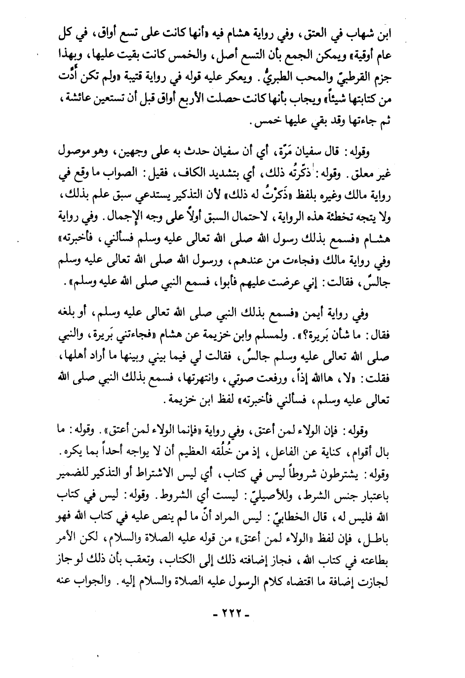 ابن شهاب في العتق، وفي رواية هشام فيه "أنها كانت على تسع أواق، في كل عام أوقية" ويمكن الجمع بأن التسع أصل، والخمس كانت بقيت عليها، وبهذا جزم القرطبيّ والمحب الطبريُّ. ويعكر عليه قوله في رواية قتيبة "ولم تكن أَدَّت من كتابتها شيئًا" ويجاب بأنها كانت حصلت الأربع أواق قبل أن تستعين عائشة، ثم جاءتها وقد بقي عليها خمس.