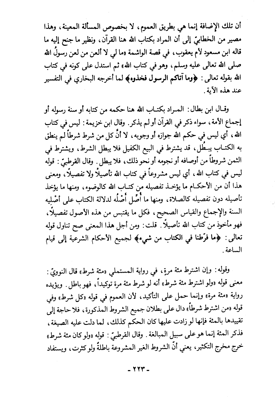 وقال ابن بطال: المراد بكتاب الله هنا حكمه من كتابه أو سنة رسوله أو إجماع الأمة، سواء ذكر في القرآن أو لم يذكر. وقال ابن خزيمة: ليس في كتاب الله، أي ليس في حكم الله جوازه أو وجوبه، لا أنَّ كل من شرط شرطًا لم ينطق به الكتاب يبطُل، قد يشترط في البيع الكفيل فلا يبطل الشرط، ويشترط في الثمن شروطاً من أوصافه أو نجومه أو نحو ذلك، فلا يبطل. وقال القرطبيّ: قوله ليس في كتاب الله، أي ليس مشروعًا في كتاب الله تأصيلًا ولا تفصيلًا، ومعنى هذا أن من الأحكام ما يؤخذ تفصيله من كتاب الله كالوضوء، ومنها ما يؤخذ تأصيله دون تفصيله كالصلاة، ومنها ما أُصِّل أصْلُه لدلالة الكتاب على أصْلِية السنة والإجماع والقياس الصحيح، فكل ما يقتبس من هذه الأصول تفصيلًا، فهو مأخوذ من كتاب الله تأصيلًا. قلت: ومن أجل هذا المعنى صح تناول قوله تعالى: {مَا فَرَّطْنَا فِي الْكِتَابِ مِنْ شَيْءٍ} لجميع الأحكام الشرعية إلى قيام الساعة.