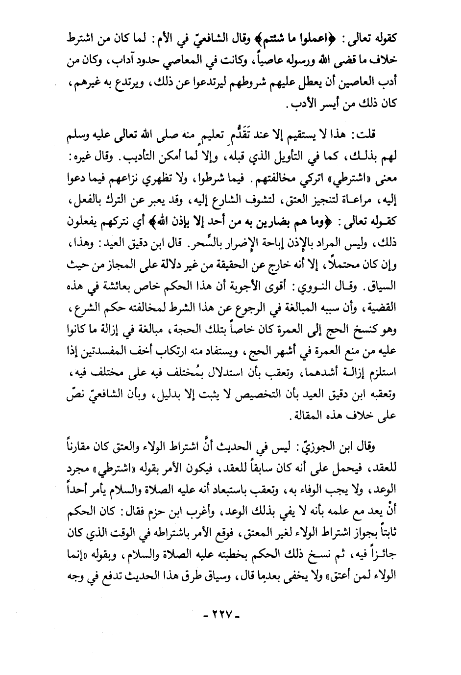 قلت: هذا لا يستقيم إلا عند تَقَدُّم تعليم منه صلى الله تعالى عليه وسلم لهم بذلك، كما في التأويل الذي قبله، وإلا لما أمكن التأديب. وقال غيره: معنى "اشترطي" اتركي مخالفتهم. فيما شرطوا, ولا تظهري نزاعهم فيما دعوا إليه، مراعاة لتنجيز العتق، لتشوف الشارع إليه، وقد يعبر عن الترك بالفعل، كقوله تعالى: {وَمَا هُمْ بِضَارِّينَ بِهِ مِنْ أَحَدٍ إِلَّا بِإِذْنِ اللَّهِ} أي نتركهم يفعلون ذلك، وليس المراد بالإذن إباحة الإضرار بالسَّحر. قال ابن دقيق العيد: وهذا، وإن كان محتملًا، إلا أنه خارج عن الحقيقة من غير دلالة على المجاز من حيث السياق. وقال النووي: أقوى الأجوبة أن هذا الحكم خاص بعائشة في هذه القضية، وأن سببه المبالغة في الرجوع عن هذا الشرط لمخالفته حكم الشرع، وهو كنسخ الحج إلى العمرة كان خاصًا بتلك الحجة، مبالغة في إزالة ما كانوا عليه من منع العمرة في أشهر الحج، ويستفاد منه ارتكاب أخف المفسدتين إذا استلزم إزالة أشدهما، وتعقب بان استدلال بمُختلف فيه على مختلف فيه، وتعقبه ابن دقيق العيد بأن التخصيص لا يثبت إلا بدليل، وبأن الشافعيّ نصّ على خلاف هذه المقالة.