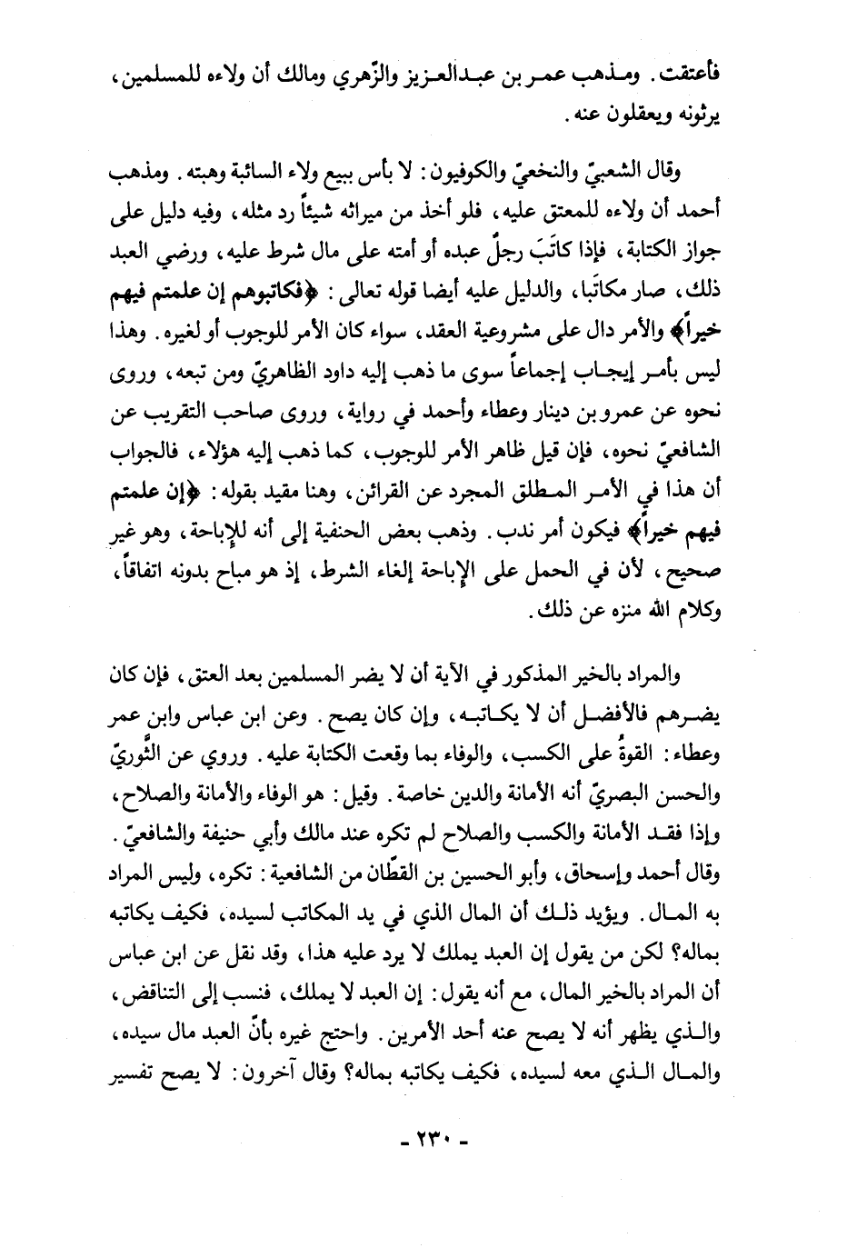 والمراد بالخير المذكور في الآية أن لا يضر المسلمين بعد العتق، فإن كان يضرهم فالأفضل أن لا يكاتبه، وإن كان يصح. وعن ابن عباس وابن عمر وعطاء: القوةُ على الكسب، والوفاء بما وقعت الكتابة عليه. وروي عن الثَّوريّ والحسن البصريّ أنه الأمانة والدين خاصة. وقيل: هو الوفاء والأمانة والصلاح، وإذا فقد الأمانة والكسب والصلاح لم تكره عند مالك وأبي حنيفة والشافعيّ. وقال أحمد وإسحاق، وأبو الحسين بن القطّان من الشافعية: تكره، وليس المراد به المال. ويؤيد ذلك أن المال الذي في يد المكاتب لسيده، فكيف يكاتبه بماله؟ لكن من يقول إن العبد يملك لا يرد عليه هذا، وقد نقل عن ابن عباس أن المراد بالخير المال، مع أنه يقول: إن العبد لا يملك، فنسب إلى التناقض، والذي يظهر أنه لا يصح عنه أحد الأمرين. واحتج غيره بأنّ العبد مال سيده، والمال الذي معه لسيده، فكيف يكاتبه بماله؟ وقال آخرون: لا يصح تفسير