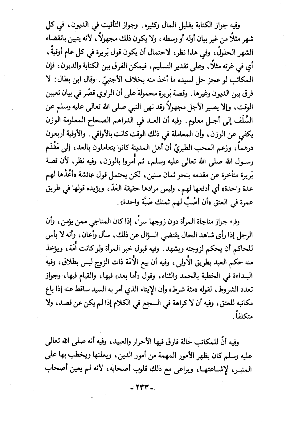 وفيه جواز الكتابة بقليل المال وكثيره. وجواز التأقيت في الديون، في كل شهر مثلًا من غير بيان أوله أو وسطه، ولا يكون ذلك مجهولًا؛ لأنه يتبين بانقضاء الشهر الحلولُ، وفي هذا نظر، لاحتمال أن يكون قول بَريرة في كل عام أوقيةً، أي في غرته مثلًا، وعلى تقدير التسليم، فيمكن الفرق بين الكتابة والديون، فإن المكاتب لو عجز حل لسيده ما أخذ منه بخلاف الأجنبىّ. وقال ابن بطال: لا فرق بين الديون وغيرها. وقصة بَريرة محمولة على أن الراوي قصّر في بيان تعيين الوقت، وإلا يصير الأجل مجهولًا وقد نهى النبي صلى الله تعالى عليه وسلم عن السَّلَف إلى أجل معلوم. وفيه أن العد في الدراهم الصحاح المعلومة الوزن يكفي عن الوزن، وأن المعاملة في ذلك الوقت كانت بالأواقي. والأوقية أربعون درهمًا، وزعم المحب الطبريّ أن أهل المدينة كانوا يتعاملون بالعد، إلى مَقْدَم رسول الله صلى الله تعالى عليه وسلم، ثم أُمروا بالوزن، وفيه نظر؛ لأن قصة بَريرة متأخرة عن مقدمه بنحو ثمان سنين، لكن يحتمل قول عائشة "أعُدَّها لهم عدة واحدة" أي أدفعها لهم، وليس مرادها حقيقة العَدّ، ويؤيده قولها في طريق عمرة في العتق "أن أصُبَّ لهم ثمنك صَبَّة واحدة".