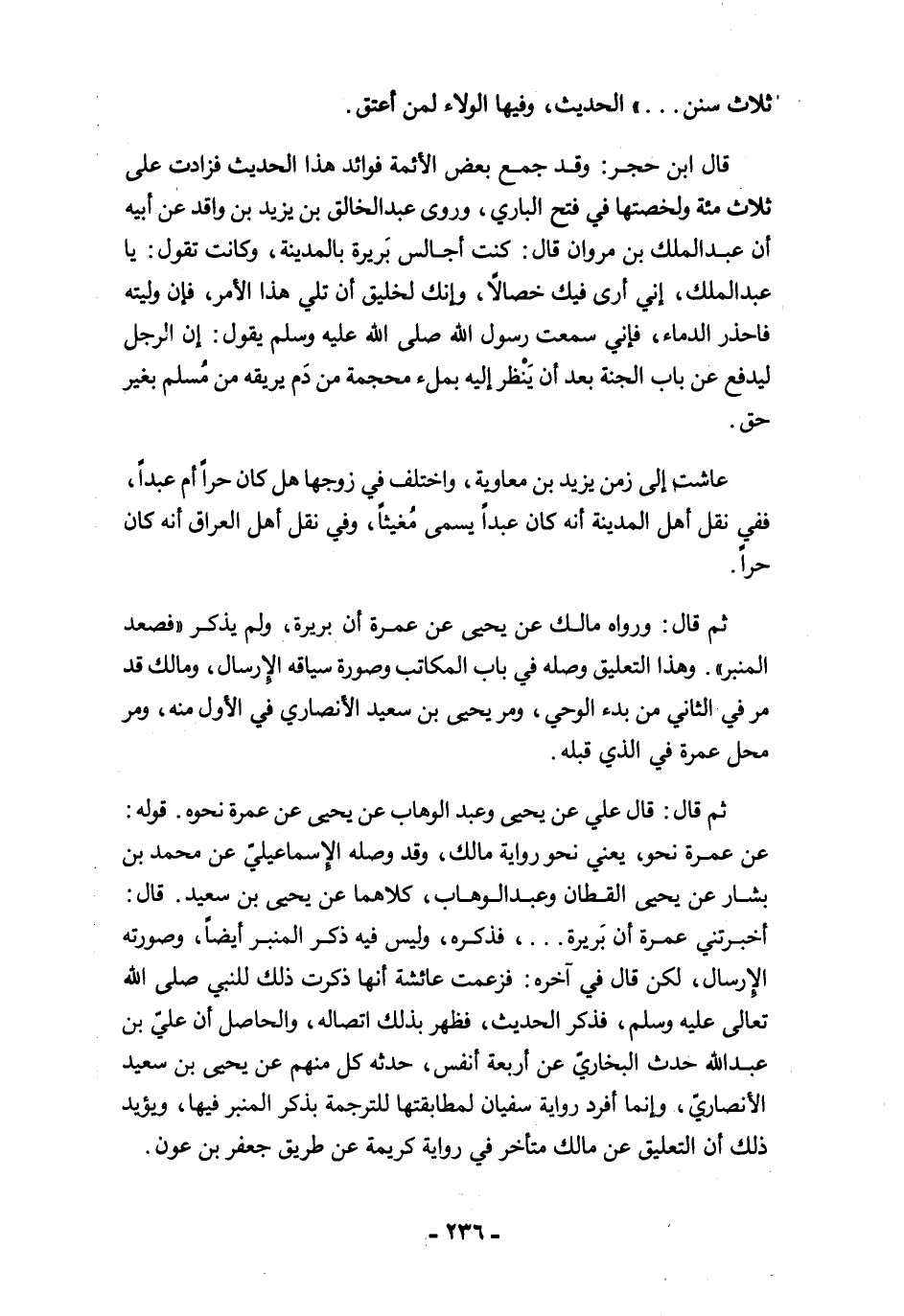 قال ابن حجر: وقد جمع بعض الأئمة فوائد هذا الحديث فزادت على ثلاث مئة ولخصتها في فتح الباري، وروى عبد الخالق بن يزيد بن واقد عن أبيه أن عبد الملك بن مروان قال: كنت أجالس بَريرة بالمدينة، وكانت تقول: يا عبد الملك، إني أرى فيك خصالًا، وإنك لخليق أن تلي هذا الأمر، فإن وليته فاحذر الدماء، فإني سمعت رسول الله صلى الله عليه وسلم يقول: إن الرجل ليدفع عن باب الجنة بعد أن يَنْظر إليه بملء محجمة من دَم يريقه من مُسلم بغير حق.