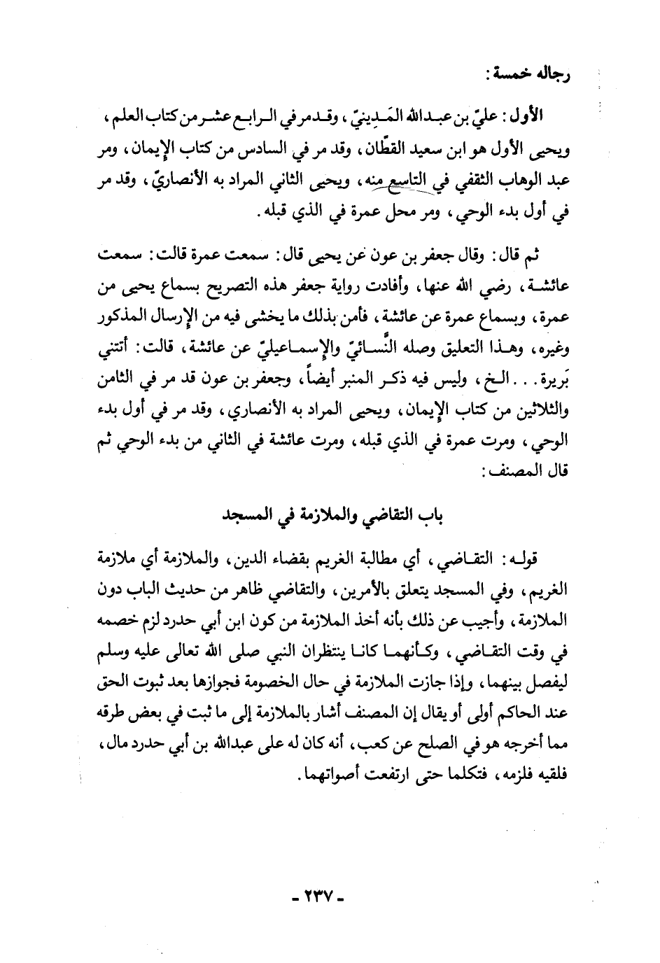 الأول: عليّ بن عبد الله المَدِينيّ، وقد مر في الرابع عشر من كتاب العلم، ويحيى الأول هو ابن سعيد القطّان، وقد مرَّ في السادس من كتاب الإيمان، ومرَّ عبد الوهاب الثقفي في التاسع منه، ويحيى الثاني المراد به الأنصاريّ، وقد مرَّ في أول بدء الوحي، ومرَّ محل عمرة في الذي قبله.