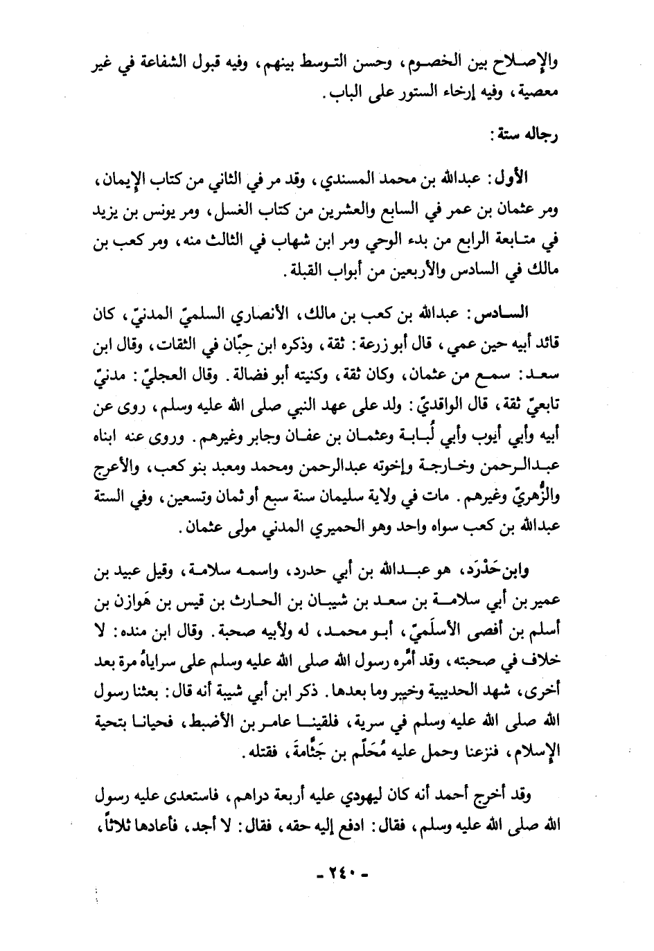 السادس: عبد الله بن كعب بن مالك، الأنصاري السلميّ المدنيّ، كان قائد أبيه حين عمي، قال أبو زرعة: ثقة، وذكره ابن حِبّان في الثقات، وقال ابن سعد: سمع من عثمان، وكان ثقة، وكنيته أبو فضالة. وقال العجليّ: مدنيّ تابعيّ ثقة، قال الواقديّ: ولد على عهد النبي صلى الله عليه وسلم، روى عن أبيه وأبي أيوب وأبي لُبابة وعثمان بن عفان وجابر وغيرهم. وروى عنه ابناه عبد الرحمن وخارجة وإخوته عبد الرحمن ومحمد ومعبد بنو كعب، والأعرج والزُّهريّ وغيرهم. مات في ولاية سليمان سنة سبع أو ثمان وتسعين، وفي الستة عبد الله بن كعب سواه واحد وهو الحميري المدني مولى عثمان.