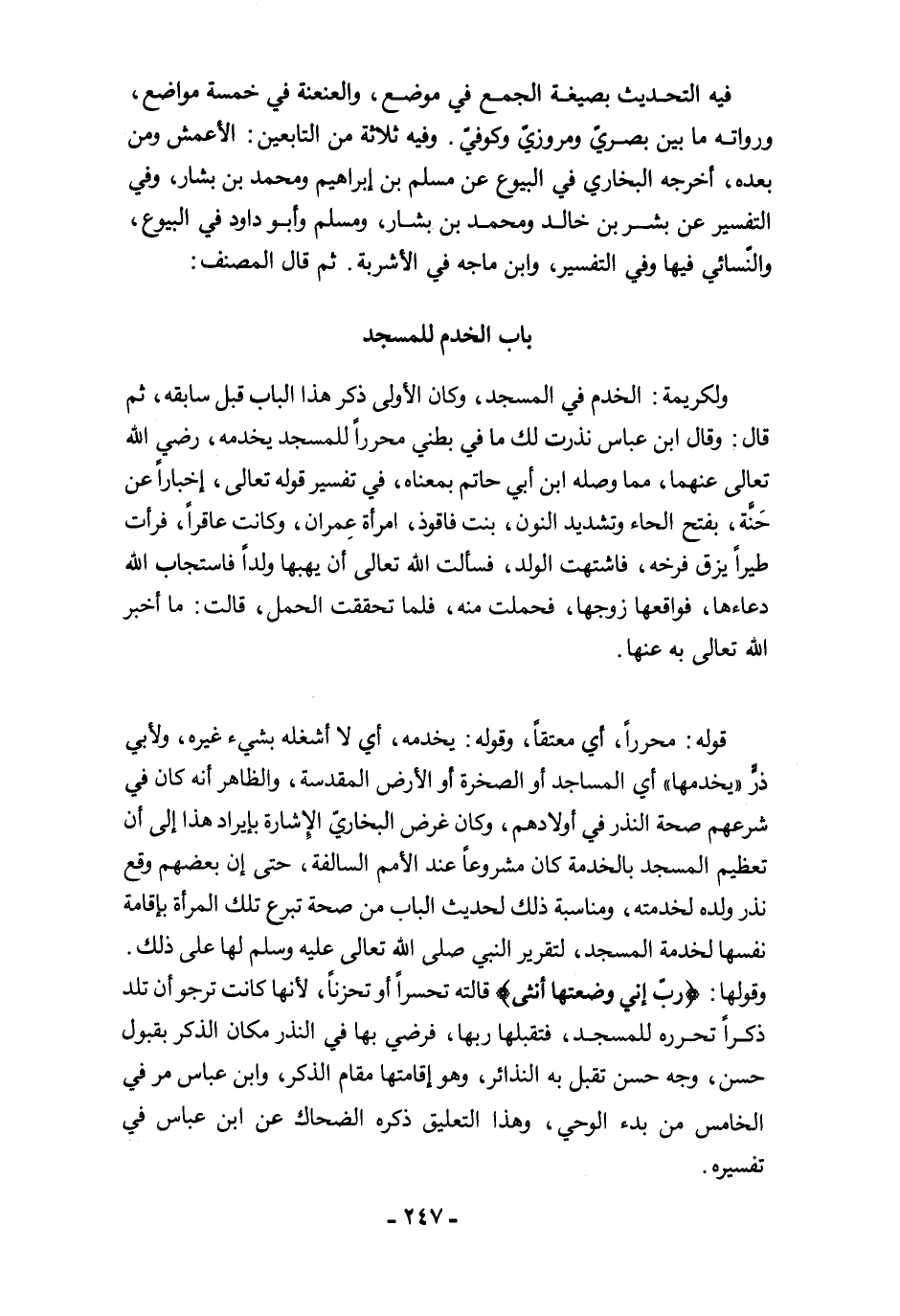 قوله: محررًا، أي معتقًا، وقوله: يخدمه، أي لا أشغله بشيء غيره، ولأبي ذرٍّ "يخدمها" أي المساجد أو الصخرة أو الأرض المقدسة، والظاهر أنه كان في شرعهم صحة النذر في أولادهم، وكان غرض البخاريّ الإِشارة بإيراد هذا إلى أن تعظيم المسجد بالخدمة كان مشروعًا عند الأمم السالفة، حتى إن بعضهم وقع نذر ولده لخدمته، ومناسبة ذلك لحديث الباب من صحة تبرع تلك المرأة بإقامة نفسها لخدمة المسجد، لتقرير النبي صلى الله تعالى عليه وسلم لها على ذلك. وقولها: {رَبِّ إِنِّي وَضَعْتُهَا أُنْثَى} قالته تحسرًا أو تحزنًا, لأنها كانت ترجو أن تلد ذكرًا تحرره للمسجد، فتقبلها ربها، فرضي بها في النذر مكان الذكر بقبول حسن، وجه حسن تقبل به النذائر، وهو إقامتها مقام الذكر، وابن عباس مرَّ في الخامس من بدء الوحي، وهذا التعليق ذكره الضحاك عن ابن عباس في تفسيره.