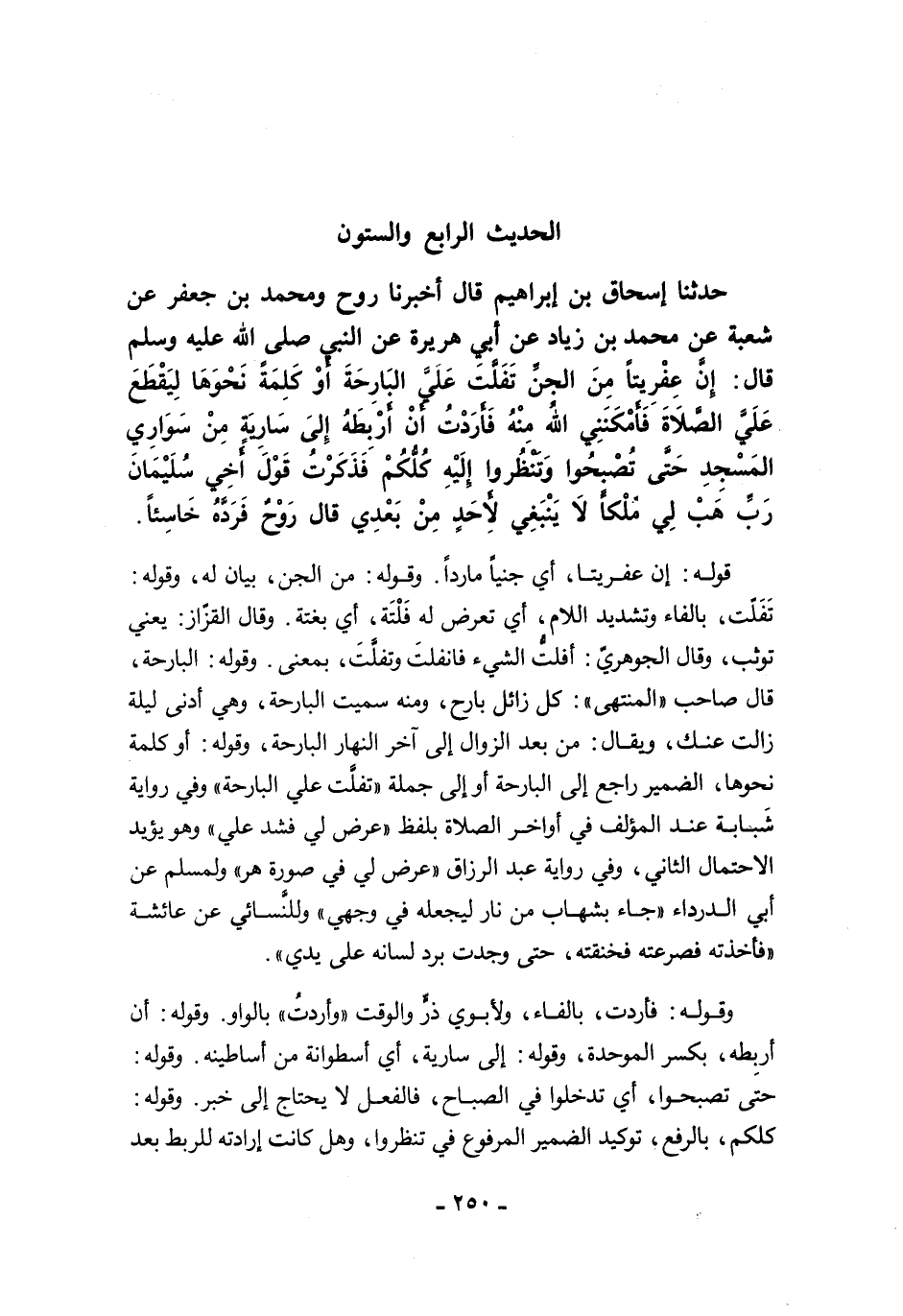 حَدَّثَنَا إِسْحَاقُ بْنُ إِبْرَاهِيمَ قَالَ أَخْبَرَنَا رَوْحٌ وَمُحَمَّدُ بْنُ جَعْفَرٍ عَنْ شُعْبَةَ عَنْ مُحَمَّدِ بْنِ زِيَادٍ عَنْ أَبِي هُرَيْرَةَ عَنِ النَّبِيِّ -صلى الله عليه وسلم- قَالَ: إِنَّ عِفْرِيتًا مِنَ الْجِنِّ تَفَلَّتَ عَلَيَّ الْبَارِحَةَ أَوْ كَلِمَةً نَحْوَهَا لِيَقْطَعَ عَلَيَّ الصَّلاَةَ، فَأَمْكَنَنِي اللَّهُ مِنْهُ، فَأَرَدْتُ أَنْ أَرْبِطَهُ إِلَى سَارِيَةٍ مِنْ سَوَارِي الْمَسْجِدِ، حَتَّى تُصْبِحُوا وَتَنْظُرُوا إِلَيْهِ كُلُّكُمْ، فَذَكَرْتُ قَوْلَ أَخِي سُلَيْمَانَ رَبِّ هَبْ لِي مُلْكًا لاَ يَنْبَغِي لأَحَدٍ مِنْ بَعْدِي. قَالَ رَوْحٌ فَرَدَّهُ خَاسِئًا.