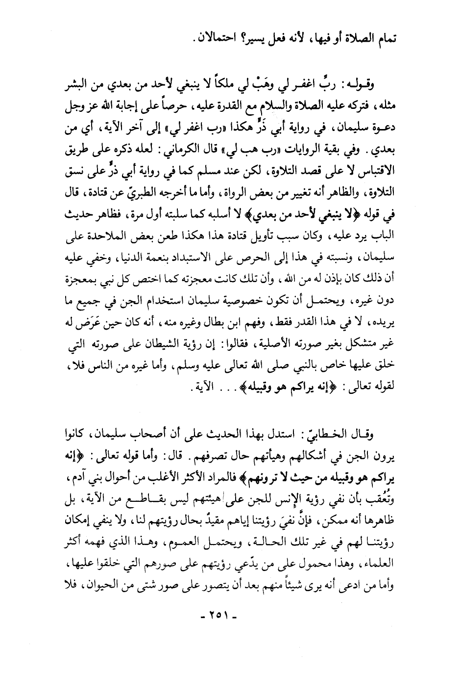 وقوله: ربِّ اغفر لي وهَبْ لي ملكًا لا ينبغي لأحد من بعدي من البشر مثله، فتركه عليه الصلاة والسلام مع القدرة عليه، حرصًا على إجابة الله عَزَّ وَجَلَّ دعوة سليمان، في رواية أبي ذَرٍّ هكذا "رب اغفر لي" إلى آخر الآية، أي من بعدي. وفي بقية الروايات "رب هب لي" قال الكرماني: لعله ذكره على طريق الاقتباس لا على قصد التلاوة، لكن عند مسلم كما في رواية أبي ذرٍّ على نسق التلاوة، والظاهر أنه تغيير من بعض الرواة، وأما ما أخرجه الطبريّ عن قتادة، قال في قوله {لَا يَنْبَغِي لِأَحَدٍ مِنْ بَعْدِي} لا أسلبه كما سلبته أول مرة، فظاهر حديث الباب يرد عليه، وكان سبب تأويل قتادة هذا هكذا طعن بعض الملاحدة على سليمان، ونسبته في هذا إلى الحرص على الاستبداد بنعمة الدنيا، وخفي عليه أن ذلك كان بإذن له من الله، وأن تلك كانت معجزته كما اختص كل نبي بمعجزة دون غيره، ويحتمل أن تكون خصوصية سليمان استخدام الجن في جميع ما يريده، لا في هذا القدر فقط، وفهم ابن بطال وغيره منه، أنه كان حين عَرَض له غير متشكل بغير صورته الأصلية، فقالوا: إن رؤية الشيطان على صورته التي خلق عليها خاص بالنبي صلى الله تعالى عليه وسلم، وأما غيره من الناس فلا، لقوله تعالى: {إِنَّهُ يَرَاكُمْ هُوَ وَقَبِيلُهُ} ... الآية.