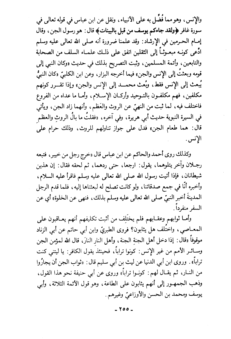 والإنس، وهو مما فُضِّل به على الأنبياء، ونقل عن ابن عباس في قوله تعالى في سورة غافر {وَلَقَدْ جَاءَكُمْ يُوسُفُ مِنْ قَبْلُ بِالْبَيِّنَاتِ} قال: هو رسول الجن، وقال إمام الحرمين في الإرشاد: وقد علمنا ضرورة أنه صلى الله تعالى عليه وسلم ادَّعى كونه مبعوثًا إلى الثقلين اتفق على ذلك علماء السلف من الصحابة والتابعين، وأئمة المسلمين، وثبت التصريح بذلك في حديث "وكان النبي إلى قومه وبعثتُ إلى الإنس والجن" فيما أخرجه البزار، وعن ابن الكلبيّ "كان النبيُّ يُبعث إلى الإنس فقط، وبُعث محمد إلى الإنس والجن" وإذا تقرر كونهم مكلفين، فهم مكلفون بالتوحيد وأركان الإِسلام، وأما ما عداه من الفروع فاختلف فيه، لما ثبت من النهيّ عن الروث والعَظم، وأنهما زاد الجن، ويأتي في السيرة النبوبة حديث أبي هريرة، وفي آخره، "فقلتُ ما بالُ الروثِ والعظمِ قال: هما طعام الجن" فدل على جواز تناولهم للروث، وذلك حرام على الإنس.