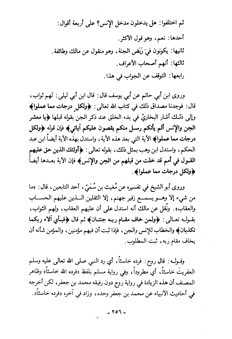 وروى ابن أبي حاتم عن أبي يوسف قال: قال ابن أبي ليلى: لهم ثواب، قال: فوجدنا مصداق ذلك في كتاب الله تعالى: {وَلِكُلٍّ دَرَجَاتٌ مِمَّا عَمِلُوا} وإلى ذلك أشار البخاري في بدء الخلق عند ذكر الجن بقوله قبلها {يَا مَعْشَرَ الْجِنِّ وَالْإِنْسِ أَلَمْ يَأْتِكُمْ رُسُلٌ مِنْكُمْ يَقُصُّونَ عَلَيْكُمْ آيَاتِي} فإن قوله {وَلِكُلٍّ دَرَجَاتٌ مِمَّا عَمِلُوا} الآية التي بعد هذه الآية، واستدل بهذه الآية أيضًا ابن عبد الحكم، واستدل ابن وهب بمثل ذلك، بقوله تعالى: {أُولَئِكَ الَّذِينَ حَقَّ عَلَيْهِمُ الْقَوْلُ فِي أُمَمٍ قَدْ خَلَتْ مِنْ قَبْلِهِمْ مِنَ الْجِنِّ وَالْإِنْسِ} فإن الآية بعدها أيضًا {وَلِكُلٍّ دَرَجَاتٌ مِمَّا عَمِلُوا}.