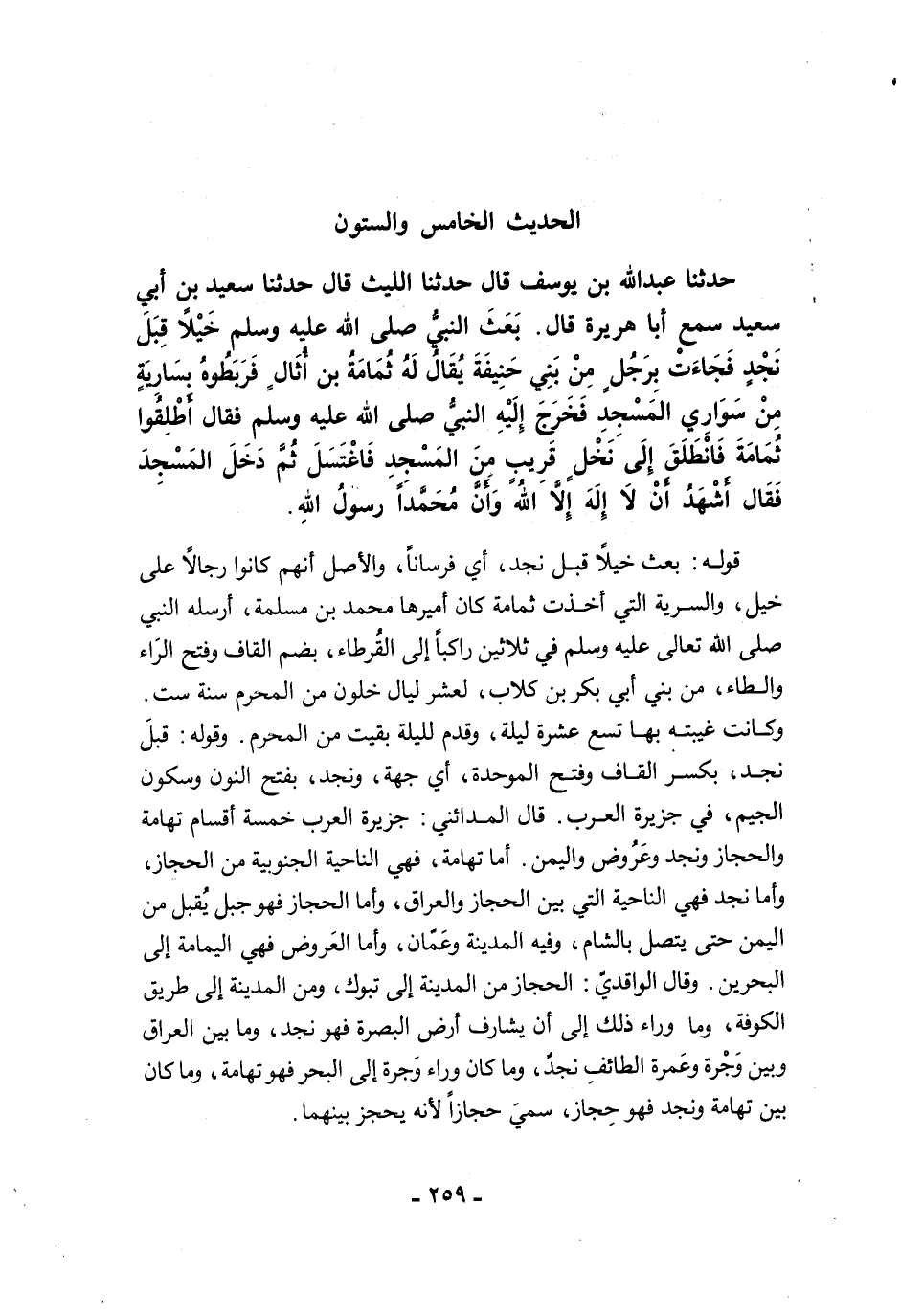 قوله: بعث خيلًا قبل نجد، أي فرسانًا، والأصل أنهم كانوا رجالًا على خيل، والسرية التي أخذت ثمامة كان أميرها محمد بن مسلمة، أرسله النبي صلى الله تعالى عليه وسلم في ثلاثين راكبًا إلى القُرطاء، بضم القاف وفتح الرَاء والطاء، من بني أبي بكر بن كلاب، لعشر ليال خلون من المحرم سنة ست. وكانت غيبته بها تسع عشرة ليلة، وقدم لليلة بقيت من المحرم. وقوله: قبلَ نجد، بكسر القاف وفتح الموحدة، أي جهة، ونجد، بفتح النون وسكون الجيم، في جزيرة العرب. قال المدائني: جزيرة العرب خمسة أقسام تهامة والحجاز ونجد وعَرُوض واليمن. أما تهامة، فهي الناحية الجنوبية من الحجاز، وأما نجد فهي الناحية التي بين الحجاز والعراق، وأما الحجاز فهو جبل يُقبل من اليمن حتى يتصل بالشام، وفيه المدينة وعَمّان، وأما العَروض فهي اليمامة إلى البحرين. وقال الواقديّ. الحجاز من المدينة إلى تبوك، ومن المدينة إلى طريق الكوفة، وما وراء ذلك إلى أن يشارف أرض البصرة فهو نجد، وما بين العراق وبين وَجْرة وعَمرة الطائفِ نجدٌ، وما كان وراء وَجرة إلى البحر فهو تهامة، وما كان بين تهامة ونجد فهو حِجاز، سميَ حجازًا لأنه يحجز بينهما.