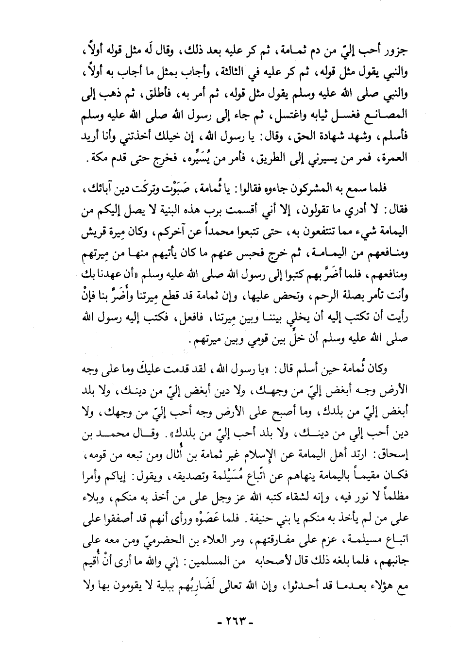 جزور أحب إليّ من دم ثمامة، ثم أكثر عليه بعد ذلك، وقال لَه مثل قوله أولًا، والنبي يقول مثل قوله، ثم كر عليه في الثالثة، وأجاب بمثل ما أجاب به أولًا، والنبي صلى الله عليه وسلم يقول مثل قوله، ثم أمر به، فأطلق، ثم ذهب إلى المصانع فغسل ثيابه واغتسل، ثم جاء إلى رسول الله صلى الله عليه وسلم فأسلم، وشهد شهادة الحق، وقال: يا رسول الله، إن خيلك أخذتني وأنا أريد العمرة، فمر من يسيرني إلى الطريق، فأمر من يُسَيِّره، فخرج حتى قدم مكة.