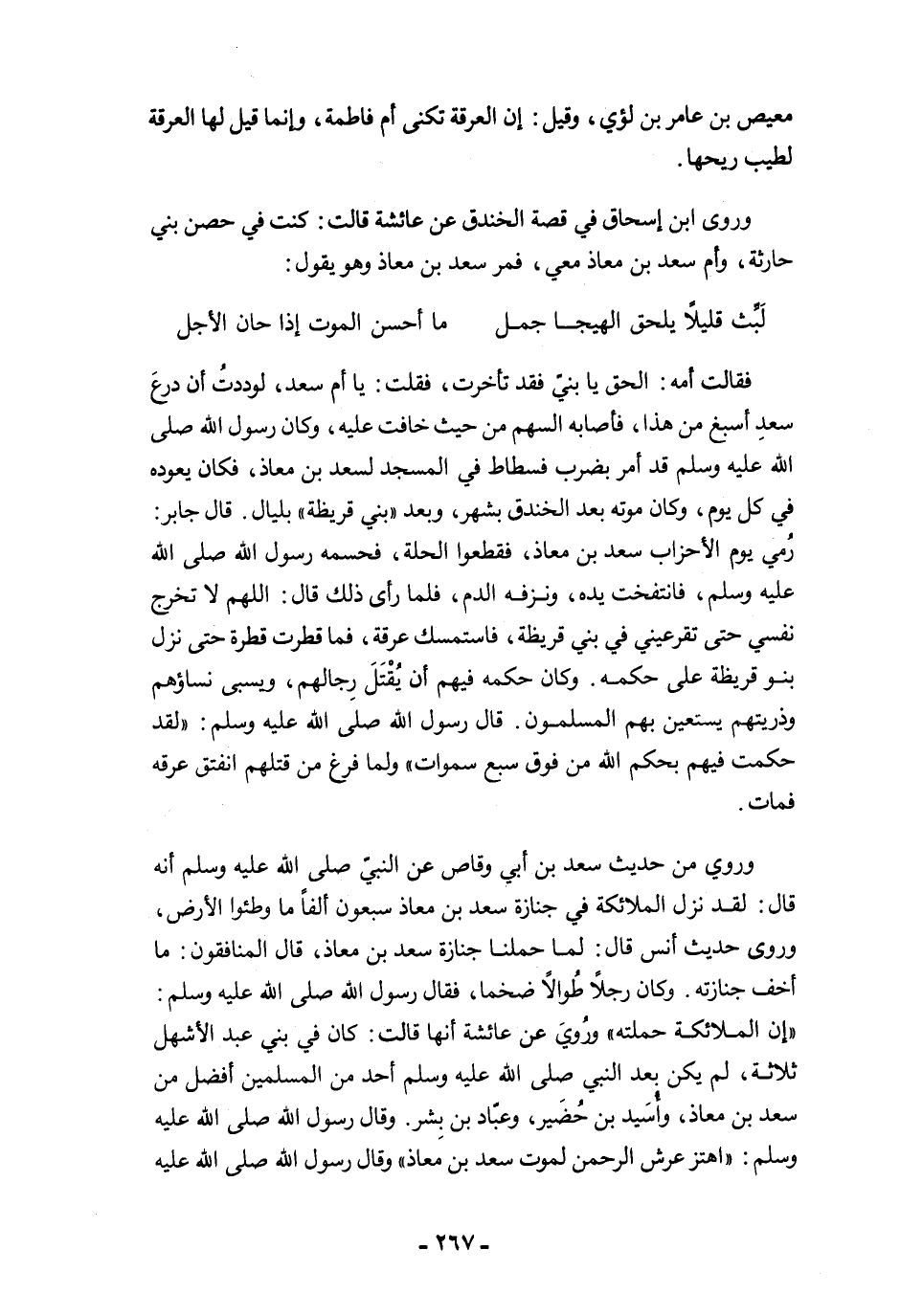 وروى ابن إسحاق في قصة الخندق عن عائشة قالت: كنت في حصن بني حارثة، وأم سعد بن معاذ معي، فمر سعد بن معاذ وهو يقول:
