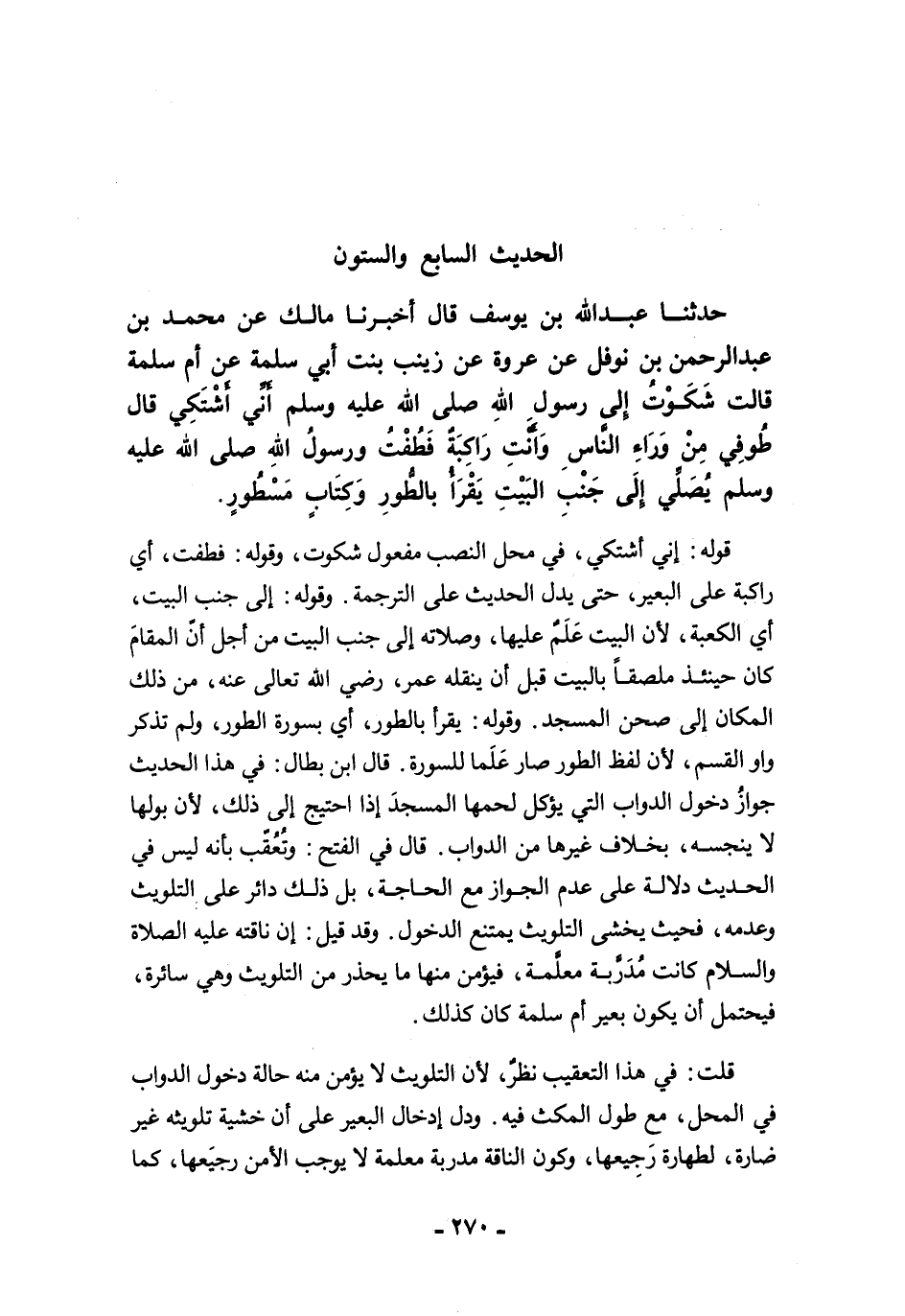 قوله: إني أشتكي، في محل النصب مفعول شكوت، وقوله: فطفت، أي راكبة على البعير، حتى يدل الحديث على الترجمة. وقوله: إلى جنب البيت، أي الكعبة؛ لأن البيت عَلَمٌ عليها، وصلاته إلى جنب البيت من أجل أنّ المقامَ كان حينئذ ملصقًا بالبيت قبل أن ينقله عمر، رضي الله تعالى عنه، من ذلك المكان إلى صحن المسجد. وقوله: يقرأ بالطور، أي بسورة الطور، ولم تذكر واو القسم, لأن لفظ الطور صار عَلَما للسورة. قال ابن بطال: في هذا الحديث جوازُ دخول الدواب التي يؤكل لحمها المسجدَ إذا احتيج إلى ذلك؛ لأن بولها لا ينجسه، بخلاف غيرها من الدواب. قال الفتح: وتُعُقّب بأنه ليس في الحديث دلالة على عدم الجواز مع الحاجة، بل ذلك دائر على التلويث وعدمه، فتحيث يخشى التلويث يمتنع الدخول. وقد قيل: إن ناقته عليه الصلاة والسلام كانت مُدَرَّبة معلَّمة، فيؤمن منها ما يحذر من التلويث وهي سائرة، فيحتمل أن يكون بعير أم سلمة كان كذلك.