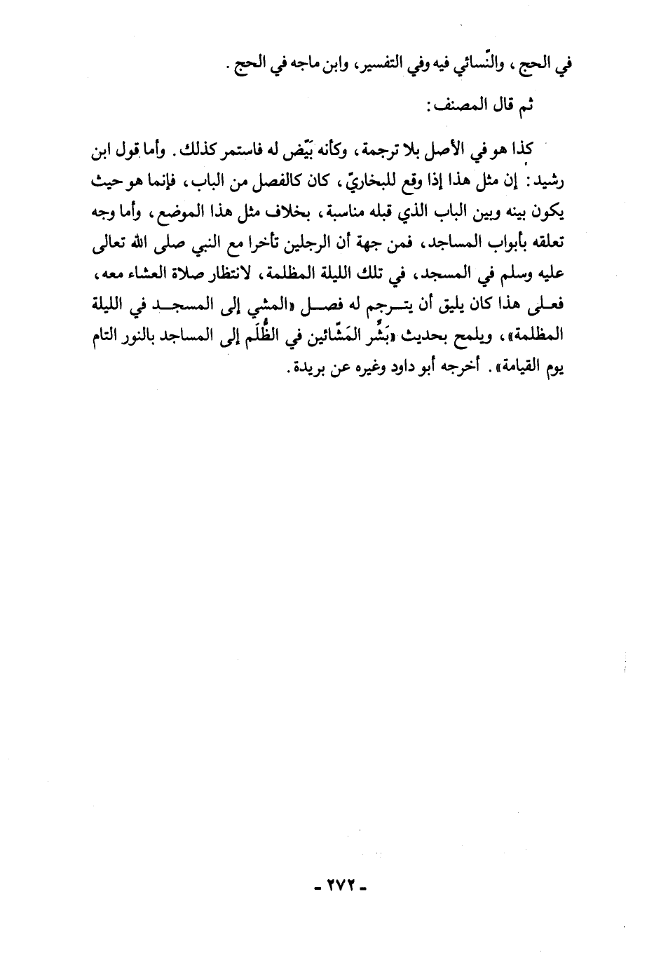 كذا هو في الأصل بلا ترجمة، وكأنه بَيّض له فاستمر كذلك. وأما. قول ابن رشيد: إن مثل هذا إذا وقع للبخاريّ، كان كالفصل من الباب، فإنما هو حيث يكون بينه ويين الباب الذي قبله مناسبة، بخلاف مثل هذا الموضع، وأما وجه تعلقه بأبواب المساجد، فمن جهة أن الرجلين تأخرا مع النبي صلى الله تعالى عليه وسلم في المسجد، في تلك الليلة المظلمة، لانتظار صلاة العشاء معه، فعلى هذا كان يليق أن يترجم له فصل "المشي إلى المسجد في الليلة المظلمة"، ويلمح بحديث "بَشَّر المَشّائين في الظُّلَم إلى المساجد بالنور التام يوم القيامة". أخرجه أبو داود وغيره عن بريدة.