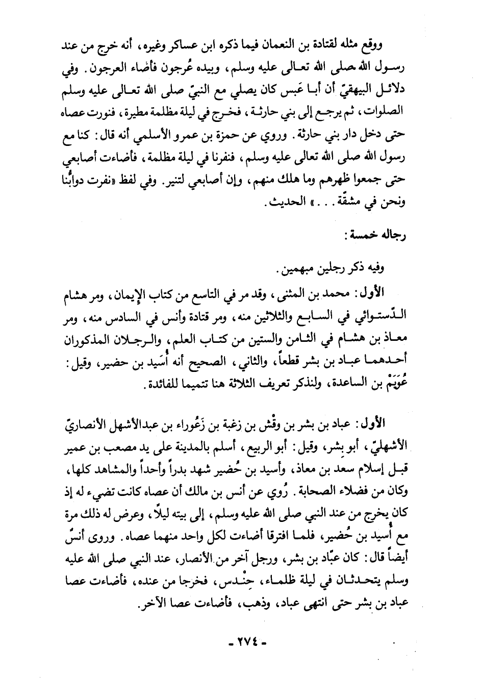 الأول: محمد بن المثنى، وقد مرَّ في التاسع من كتاب الإيمان, ومرَّ هشام الدّستوائي في السابع والثلاثين منه، ومرَّ قتادة وأنس في السادس منه، ومرَّ معاذ بن هشام في الثامن والستين من كتاب العلم، والرجلان المذكوران أحدهما عباد بن بشر قطعًا، والثاني، الصحيح أنه أُسَيد بن حضير، وقيل: عُوَيمْ بن الساعدة، ولنذكر تعريف الثلاثة هنا تتميما للفائدة.