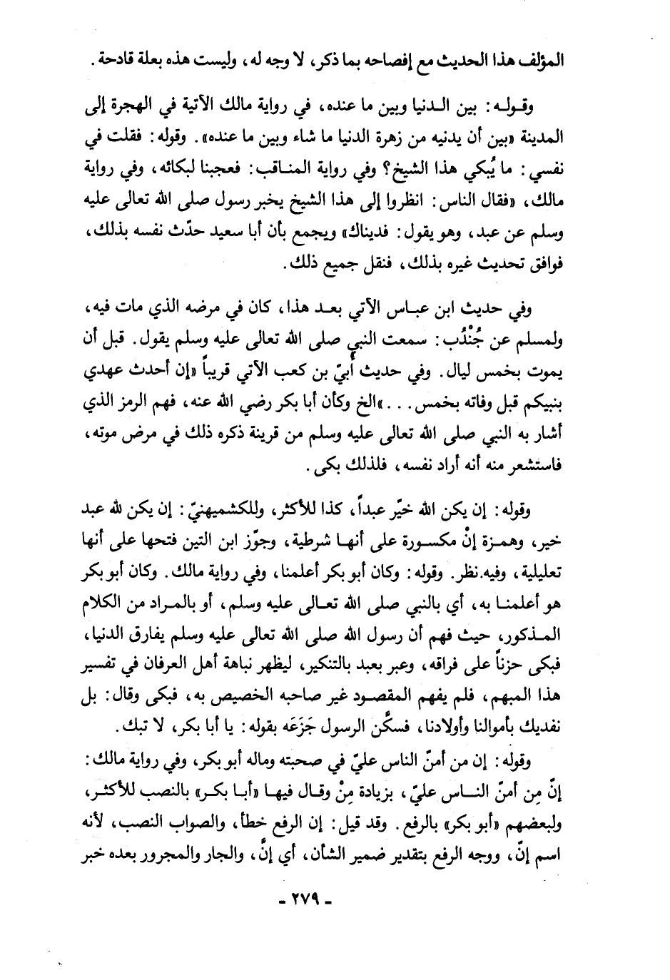 وفي حديث ابن عباس الآتي بعد هذا، كان في مرضه الذي مات فيه، ولمسلم عن جُنْدُب: سمعت النبي صلى الله تعالى عليه وسلم يقول. قبل أن يموت بخمس ليال. وفي حديث أبيّ بن كعب الآتي قريبًا "إن أحدث عهدي بنبيكم قبل وفاته بخمس ... " الخ وكأن أبا بكر رضي الله عنه، فهم الرمز الذي أشار به النبي صلى الله تعالى عليه وسلم من قرينة ذكره ذلك في مرض موته، فاستشعر منه أنه أراد نفسه، فلذلك بكى.
