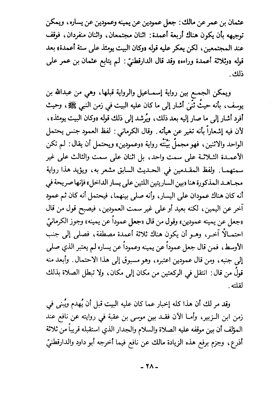 عثمان بن عمر عن مالك: جعل عمودين عن يمينه وعمودين عن يساره، ويمكن توجيهه بأن يكون هناك أربعة أعمدة: اثنان مجتمعان، واثنان منفردان، فوقف عند المجتمعين، لكن يعكر عليه قوله "وكان البيت يومئذ على ستة أعمدة" بعد قوله "وثلاثة أعمدة وراءه" وقد قال الدارقطني: لم يتابع عثمان بن عمر على ذلك.
