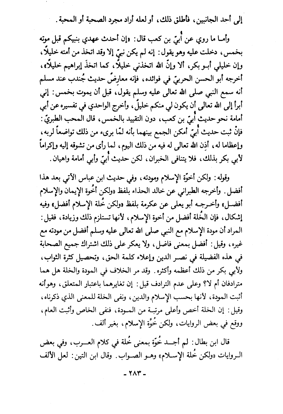 وأما ما روي عن أُبيّ بن كعب قال:"إن أحدث عهدي بنبيكم قبل موته بخمس، دخلت عليه وهو يقول: إنه لم يكن نبيّ إلا وقد اتخذ من أمته خليلاً, وان خليلي أبو بكر، ألا وإنّ الله اتخذني خليلًا، كما اتخذَ إبراهيم خليلًا"، أخرجه أبو الحسن الحربيّ في فوائده، فإنه معارِضٌ حديث جُندب عند مسلم أنه سمع النبي صلى الله تعالى عليه وسلم يقول، قبل أن يموت بخمس: إني أبرأ إلى الله تعالى أن يكون لي منكم خليلٌ، وأخرج الواحدي في تفسيره عن أبي أمامة نحو حديث أُبيّ بن كعب، دون التقييد بالخمس، قال المحب الطبريّ: فإنْ ثبت حديث أُبيّ أمكن الجمع بينهما بأنه لمّا برىء من ذلك تواضعًا لربه، وإعظاما له، أذِن الله تعالى له فيه من ذلك اليوم، أما رأى من تشوقه إليه وإكرامًا لأبي بكر بذلك، فلا يتنافى الخبران، لكن حديث أُبيّ وأبي أمامة واهيان.