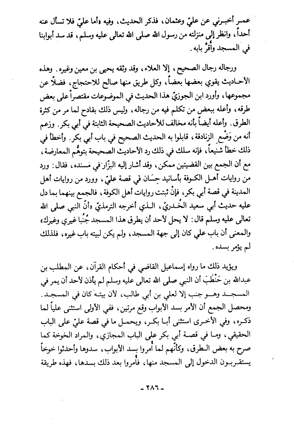 ورجاله رجال الصحيح، إلا العلاء، وقد وثقه يحيى بن معين وغيره. وهذه الأحاديث يقوي بعضها بعضًا، وكل طريق منها صالح للاحتجاج، فضلًا عن مجموعها، وأورد ابن الجوزيّ هذا الحديث في الموضوعات مقتصرًا على بعض طرقه، وأعله ببعض من تكلم فيه من رجاله، وليس ذلك بقادح لما مر من كثرة الطرق. وأعله أيضًا بأنه مخالف للأحاديث الصحيحة الثابتة في أبي بكر. وزعم أنه من وَضْعِ الزنادقة، قابلوا به الحديث الصحيح في باب أبي بكر. وأخطأ في ذلك خطأ شنيعًا، فإنه سلك في ذلك رد الأحاديث الصحيحة بتوهُّم المعارضة، مع أن الجمع بين القضيتين ممكن، وقد أشار إليه البزّار في مسنده، فقال: ورد من روايات أهل الكوفة بأسانيد حِسَان في قصة عليّ، وورد من روايات أهل المدينة في قصة أبي بكر، فإنْ ثبتت روايات أهل الكوفة، فالجمع بينهما بما دل عليه حديث أبي سعيد الخُدريّ، الذي أخرجه الترمذيّ "أنّ النبي صلى الله تعالى عليه وسلم قال: لا يحل لأحد أن يطرق هذا المسجد جُنُبا غيري وغيرك" والمعنى أن باب علي كان إلى جهة المسجد، ولم يكن لبيته باب غيره، فلذلك لم يؤمر بسده.
