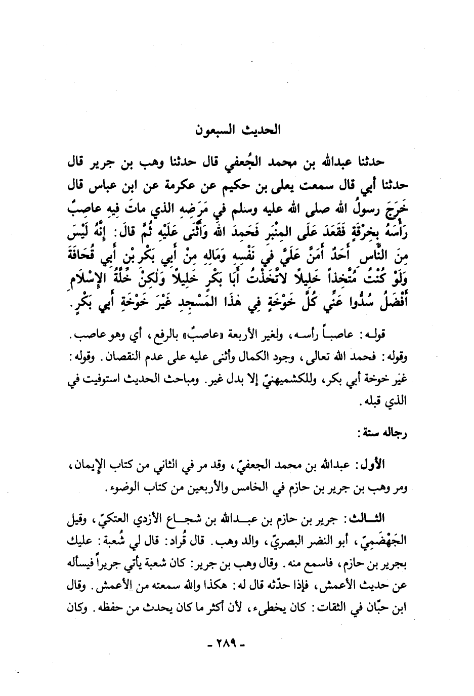 حَدَّثَنَا عَبْدُ اللَّهِ بْنُ مُحَمَّدٍ الْجُعْفِيُّ قَالَ حَدَّثَنَا وَهْبُ بْنُ جَرِيرٍ قَالَ حَدَّثَنَا أَبِي قَالَ سَمِعْتُ يَعْلَى بْنَ حَكِيمٍ عَنْ عِكْرِمَةَ عَنِ ابْنِ عَبَّاسٍ قَالَ خَرَجَ رَسُولُ اللَّهِ -صلى الله عليه وسلم- فِي مَرَضِهِ الَّذِى مَاتَ فِيهِ عَاصِبٌ رَأْسَهُ بِخِرْقَةٍ، فَقَعَدَ عَلَى الْمِنْبَرِ، فَحَمِدَ اللَّهَ وَأَثْنَى عَلَيْهِ ثُمَّ قَالَ: إِنَّهُ لَيْسَ مِنَ النَّاسِ أَحَدٌ أَمَنَّ عَلَيَّ فِي نَفْسِهِ وَمَالِهِ مِنْ أَبِي بَكْرِ بْنِ أَبِي قُحَافَةَ، وَلَوْ كُنْتُ مُتَّخِذًا مِنَ النَّاسِ خَلِيلاً لاَتَّخَذْتُ أَبَا بَكْرٍ خَلِيلاً، وَلَكِنْ خُلَّةُ الإِسْلاَمِ أَفْضَلُ، سُدُّوا عَنِّي كُلَّ خَوْخَةٍ فِي هَذَا الْمَسْجِدِ غَيْرَ خَوْخَةِ أَبِي بَكْرٍ.