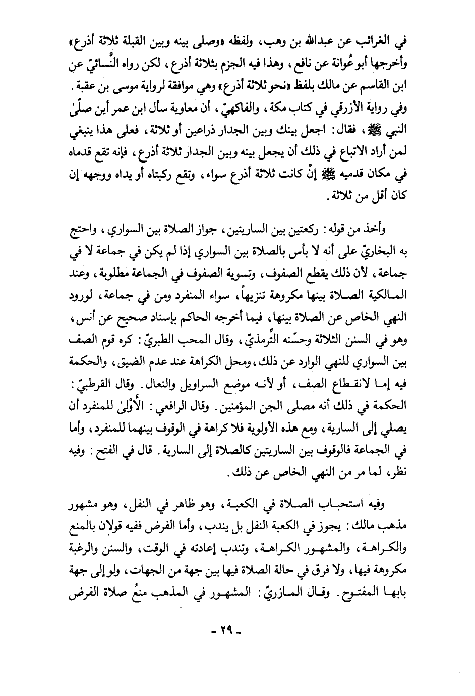 في الغرائب عن عبد الله بن وهب، ولفظه "وصلى بينه وبين القبلة ثلاثة أذرع" وأخرجها أبو عُوانة عن نافع، وهذا فيه الجزم بثلاثة أذرع، لكن رواه النسائي عن ابن القاسم عن مالك بلفظ "نحو ثلاثة أذرع" وهي موافقة لرواية موسى بن عقبة. وفي رواية الأزرقي في كتاب مكة، والفاكهيّ، أن معاوية سأل ابن عمر أين صلّى النبي -صلى الله عليه وسلم-، فقال: اجعل بينك ويين الجدار ذراعين أو ثلاثة، فعلى هذا ينبغي لمن أراد إلاتباع في ذلك أن يجعل بينه وبين الجدار ثلاثة أذرع، فإنه تقع قدماه في مكان قدميه -صلى الله عليه وسلم- إنْ كانت ثلاثة أذرع سواء، وتقع ركبتاه أو يداه ووجهه إن كان أقل من ثلاثة.