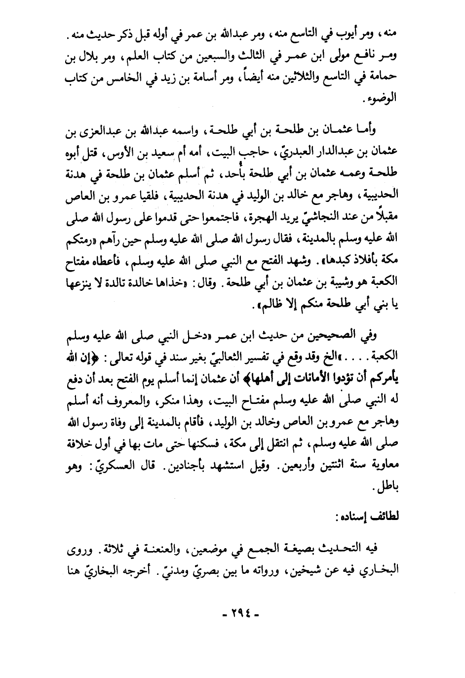 وفي الصحيحين من حديث ابن عمر "دخل النبي صلى الله عليه وسلم الكعبة .... " الخ وقد وقع في تفسير الثعالبيّ بغير سند في قوله تعالى: {إِنَّ اللَّهَ يَأْمُرُكُمْ أَنْ تُؤَدُّوا الْأَمَانَاتِ إِلَى أَهْلِهَا} أن عثمان إنما أسلم يوم الفتح بعد أن دفع له النبي صلى الله عليه وسلم مفتاح البيت، وهذا منكر، والمعروف أنه أسلم وهاجر مع عمرو بن العاص وخالد بن الوليد، فأقام بالمدينة إلى وفاة رسول الله صلى الله عليه وسلم، ثم انتقل إلى مكة، فسكنها حتى مات بها في أول خلافة معاوية سنة اثنتين وأربعين. وقيل استشهد بأجنادين. قال العسكريّ: وهو باطل.