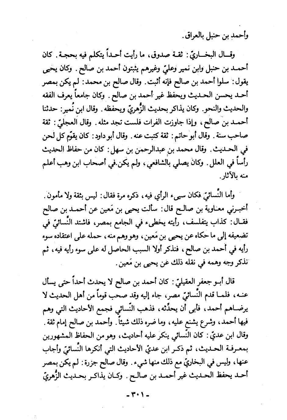 قال أبو جعفر العقيليّ: كان أحمد بن صالح لا يحدث أحدًا حتى يسأل عنه، فلما قدم النَّسائيّ مصر، جاء إليه وقد صحب قومًا من أهل الحديث لا يرضاهم أحمد، فأبى أن يحدِّثه، فذهب النسائي فجمع الأحاديث التي وهم فيها أحمد، وشرع يشنع عليه، وما ضره ذلك شيئًا. وأحمد بن صالح إمام ثقة. وقال ابن عديّ: كان النّسائي ينكر عليه أحاديث، وهو من الحفاظ المشهورين بمعرفة الحديث، ثم ذكر ابن عديّ الأحاديث التي أنكرها النَّسائيّ وأجاب عنها, وليس في البخاريّ مع ذلك منها شيء. وقال صالح جزرة: لم يكن بمصر أحد يحفظ الحديث غير أحمد بن صالح. وكان يذاكر بحديث الزُّهريّ