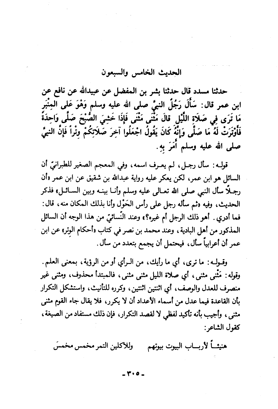 وقوله: ما ترى، أي ما رأيك، من الرأي أو من الرؤية، بمعنى العلم. وقوله: مَثْنى مثنى، أي صلاة الليل مثنى مثنى، فالمبتدأ محذوف، ومثنى غير منصرف للعدل والوصف، أي اثنتين اثنتين، وكرره للتأنيث، واستشكل التكرار بأن القاعدة فيما عدل من أسماء الأعداد أن لا يكرر، فلا يقال جاء القوم مثنى مثنى، وأجيب بأنه تكيد لفظي لا لقصد التكرار، فإن ذلك مستفاد من الصيغة، كقول الشاعر: