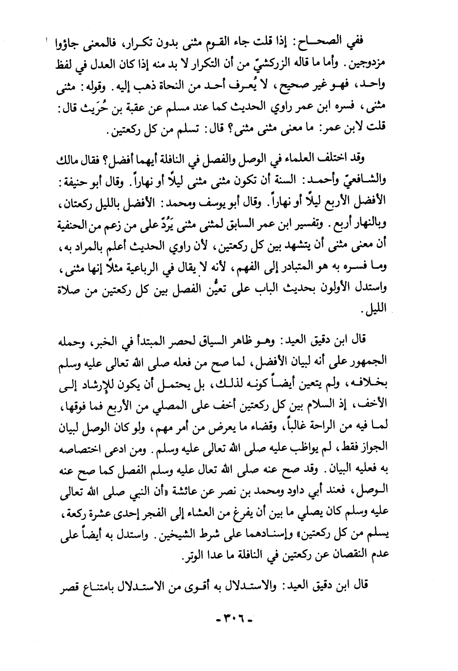 قال ابن دقيق العيد: وهو ظاهر السياق لحصر المبتدأ في الخبر، وحمله الجمهور على أنه لبيان الأفضل، أما صح من فعله صلى الله تعالى عليه وسلم بخلافه، ولم يتعين أيضًا كونه لذلك، بل يحتمل أن يكون للإرشاد إلى الأخف، إذ السلام بين كل ركعتين أخف على المصلي من الأربع فما فوقها، لما فيه من الراحة غالبًا، وقضاء ما يعرض من أمر مهم، ولو كان الوصل لبيان الجواز فقط، لم يواظب عليه صلى الله تعالى عليه وسلم. ومن ادعى اختصاصه به فعليه البيان. وقد صح عنه صلى الله تعالى عليه وسلم الفصل كما صح عنه الوصل، فعند أبي داو ومحمد بن نصر عن عائشة "أن النبي صلى الله تعالى عليه وسلم كان يصلي ما بين أن يفرغ من العشاء إلى الفجر إحدى عشرة ركعة، يسلم من كل ركعتين" وإسنادهما على شرط الشيخين. واستدل به أيضًا على عدم النقصان عن ركعتين في النافلة ما عدا الوتر.