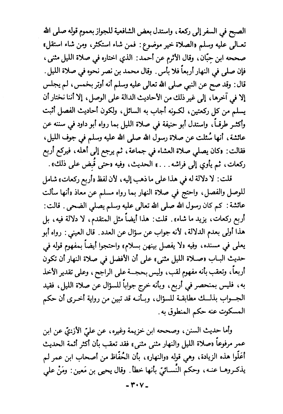 وأما حديث السنن، وصححه ابن خزيمة وغيره، عن عليّ الأزديّ عن ابن عمر مرفوعًا "صلاة الليل والنهار مثنى مثنى" فقد تعقب بان أكثر أئمة الحديث أعَلّوا هذه الزيادة، وهي قوله "والنهار"، بان الحُفّاظ من أصحاب ابن عمر لم يذكروها عنه، وحكم النَّسائيّ بأنها خطأ. وقال يحيى بن مَعين: ومَنْ علي