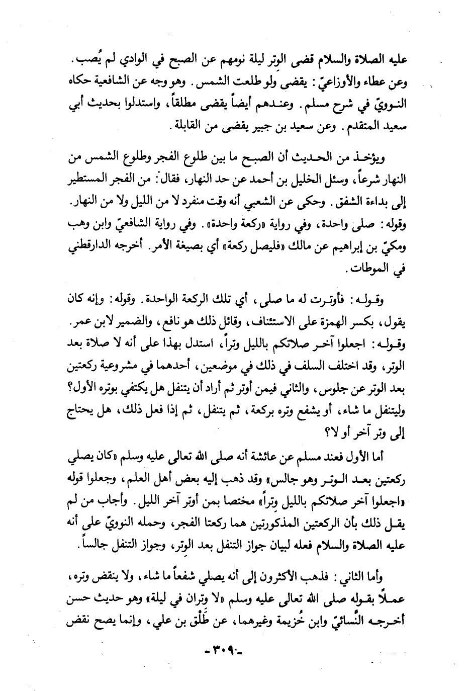 وأما الثاني: فذهب الأكثرون إلى أنه يصلي شفعًا ما شاء، ولا ينقض وتره، عملًا بقوله صلى الله تعالى عليه وسلم "لا وِتران في ليلة" وهو حديث حسن أخرجه النَّسائيّ وابن خُزيمة وغيرهما، عن طَلْق بن علي، وإنما يصح نقض