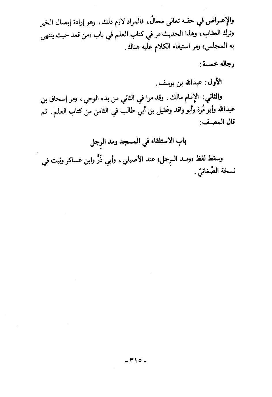 والثاني: الإِمام مالك. وقد مرا في الثاني من بدء الوحي، ومرَّ إسحاق بن عبد الله وأبو مُرة وأبو واقد وعَقيل بن أبي طالب في الثامن من كتاب العلم. ثم قال المصنف: